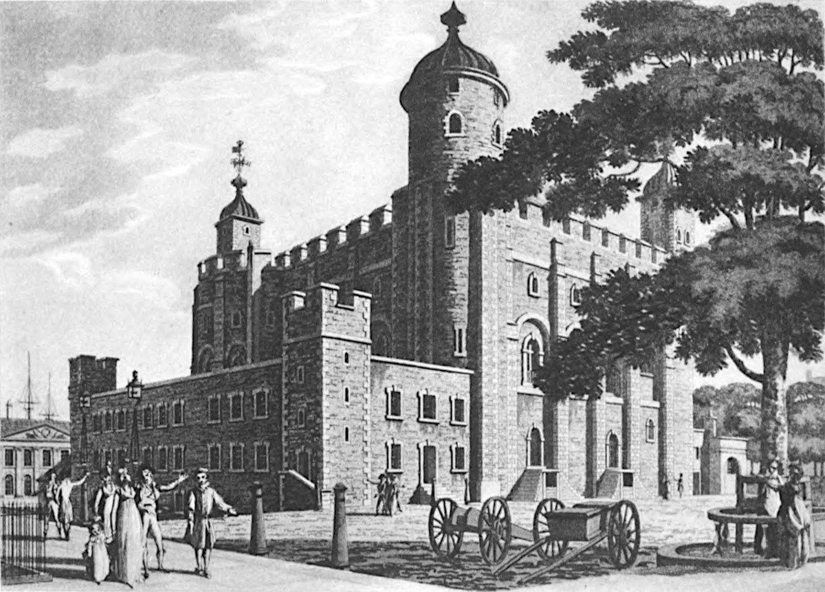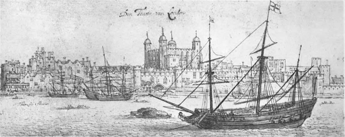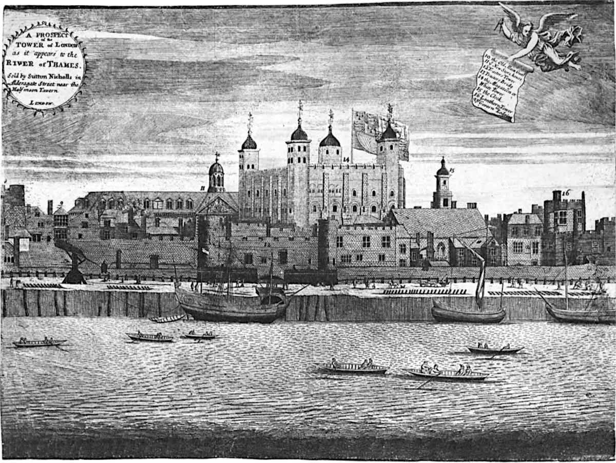 In Nichols’s “Progresses,” that mine of information regarding James I., his court and times, it is related that James paid his first visit to the Tower on 3rd May 1603, “when His Majesty set forward from the Charter House and went quietly on horseback to Whitehall where he took barge. Having shot the bridge, his present landing was expected at the Tower stayres, but it pleased His Highness to passe the Towre stairs toward St Katherines, and there stayed on the water to see the ordinance on the White Tower (commonly called Julius Cæsar’s Tower) being in number twenty pieces, with the great ordinance on the Towre wharfe, being in number 100, and chalmers to the number of 130, discharged and shot off. Of which, all services were sufficiently performed by the gunners, that a peale of so good order was never heard before; which was most commendable to all sorts, and very acceptable to the King.”[1]