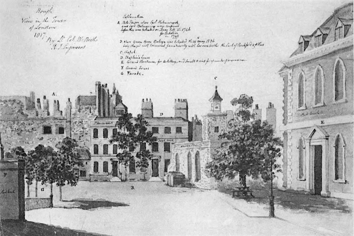 Lord Grey de Wilton, a young man of great promise, died in St Thomas’s Tower in 1617, after passing nine years in the Brick Tower. Lord Grey had made an eloquent defence during his trial, which lasted from eight in the morning until eight at night, during which, according to the Hardwicke State Papers, many “subtle traverses and escapes,” took place. When Grey was asked why judgment of death should not be passed against him, he replied, “I have nothing to say.” Then he paused a little, and added, “And yet a word of Tacitus comes into my mind,8 ‘non eadem omnibus decora,’ the house of the Wiltons have spent many lives in their Princes’ service and Grey cannot beg his.”