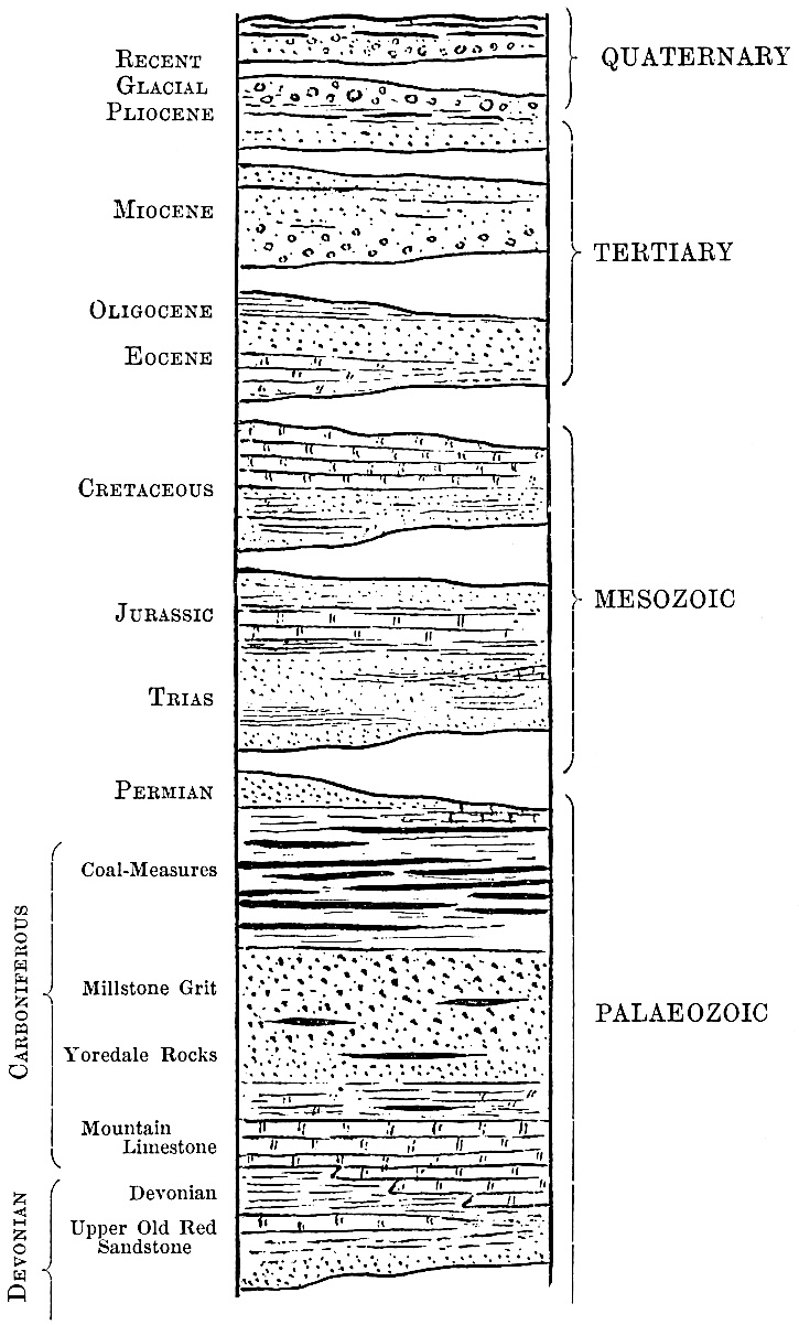 strata. Table of Strata: I. Archaean, 34–36. II. Cambrian, 36–37. III. Ordovician, 37–38. IV. Silurian, 38. V. Devonian, 39. VI. Carboniferous, 39–45. VII. Permian, 45–47. VIII. Trias., 47–48. IX. Jurassic, 48–49. X. Cretaceous, 50–51. XI. Tertiary, 51–53. Geological Evolution. |
