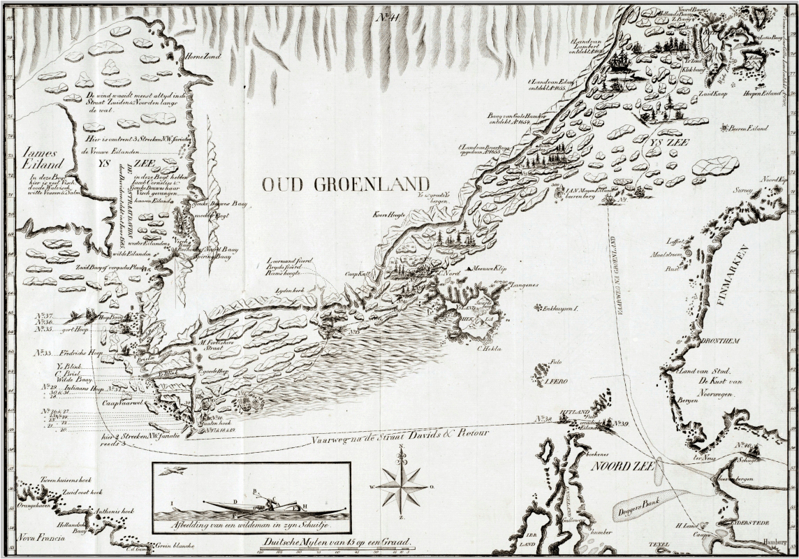 Den 1sten Mei geene robben meer kunnende vangen, zetten wij met verscheidene schepen de reize om de Noord door het ijs voort, koers houdende op Spitsbergen, en kwamen den 13 Mei (No 2.) op 75 gr. 30 min. N.B. tegen het Zuidijs; op den 17den (No 3.) raakten wij met verscheidene schepen door hetzelve heen op 78 gr. 30 min. N.B., en, van daar om de West zeilende, kwamen wij op den 26sten aan de Westijsvelden; hier werden door verscheidene schepen eenige Walvisschen gevangen. Vervolgens geraakten wij van den koers af, dreven op goed geluk heen en maakten nu en dan de schepen aan de ijsvelden of schotsen vast.—Op den 1 Julij (No 4.) bevonden wij ons op 72 gr. 30 min. N.B. In dien tusschentijd vingen wij eenen Walvisch van 30 vaten spek. Nu eens dreven wij met 27 schepen in getal in het ijs, dan bevonden wij ons weêr tusschen het ijs op vrij water. Sommige schepen vingen toen nog eenige Walvisschen. Tot den 4den dreven wij onophoudelijk sterk om de Zuid-west, uit hoofde van den stroom en den harden wind uit het Noord-oosten. Tot hiertoe zagen wij geen land, drijvende bestendig met het ijs om de Zuid-west tot den 12den. Toen geraakten wij met 27 schepen sterk in het ijs bezet, en hadden 3 a 4 dagen zwaren storm uit het Noord-oosten en geen gezigt wegens den dikken mist tot den 16den (No 5.).—Toen opende zich de lucht en kregen wij de kust van Gale-Hamkes, op eenen afstand van 10 a 12 mijlen, ten Noord-westen, in het gezigt. Wij zagen toen nog 27 schepen rondom ons en dreven sterk om de Zuid-west. Het weêr bedaarde. Van 16 Julij tot 1 Augustus geraakten eenige schepen uit ons gezigt. In dien tusschentijd vingen wij nog eenen kleinen Walvisch in gemeenschap met Kommandeur HANS PIETERS. Voorts dreven wij zonder ophouden door den sterken stroom en wind uit het Noord-oosten om de Zuid-west tot den 6 Augustus (No 6.). Toen geraakten eenige schepen uit ons gezigt, van welke eenige met een gedeelte van het volk vergaan zijn. Wij bleven met 5 schepen in het ijs ingesloten, liggende aan een klein ijsveld vast gemaakt, te weten Kommandeur HANS PIETERS, PIETER ANDERSEN, HANS CHRISTIAAN JASPERS, ALBERT JANS en HIDDE DIRKS KAT, alle vijf met Hamburger schepen. Dit was op 68 gr. 30 min. N.B. Hier zagen wij het land niet meer, maar niets dan ijsbergen, welke, met de toppen in de wolken, het land bedekken. Men kan dezelve wel 16 a 18 mijlen ver zien. Even zoo vond ik naderhand het land op 62 gr. 30 min. N.B. in de Straat Davis benoorden Kaap Vaarwel. Van den 6den tot den 16den dreven wij door den sterken Noord-oosten wind en den stroom met het ijs om de Zuid-west. Tot den 18den werkte het ijs geweldig door malkander, hetwelk te midden van den storm afgrijsselijk was te aanschouwen. In dien schrikbarenden toestand werden de schepen van Kommandeur PIETER ANDERSEN en ALBERT JANS door het ijs verbrijzeld. De manschap redde zich op het ijs, wordende een gedeelte van den leeftogt door dezelve geborgen. Wij verdeelden de manschap met den leeftogt op de drie overgeblevene schepen, welke nabij de verongelukte in het ijs beklemd lagen, op ieder van welke zich nu 78 zielen bevonden. Dit gebeurde op 67 gr. N.B. Nadat wij van de 5, 2 schepen verloren hadden, dreef het Walvisch-spek en de Traan om ons heen, op welker reuk de Beeren in menigte af kwamen, waarvan wij eenige dood schoten, die door het volk van de twee bij ons zijnde schepen, wegens gebrek aan leeftogt, werden ingezouten. De zoodanige, die er dadelijk van aten, vonden dit vleesch niet onsmakelijk, maar na verloop van twee dagen, ging hun het vel in den mond en van de tong als mede op andere plaatsen van het ligchaam en van handen en voeten af. Volgens het oordeel van Koopman ANDREAS OELZEN had men het, vóór het inzouten, ter deeg moeten laten uitvriezen, alsdan zoude het een onschadelijk voedsel zijn geworden. De Beeren veroorloofden ons niet, om gedurende den nacht van het een tot het ander schip te gaan en verlieten ons niet, vóór dat wij van het omdrijvende spek verwijderd waren. Voorts dreven wij met onze drie in het ijs bezette schepen gedurig om de West tot den 24 Augustus (No 8.). Toen konden wij uit den top van den mast het eiland IJsland zien en tevens de vrije zee, hetwelk ons hoop gaf, dat wij met onze schepen dit eiland zouden kunnen bereiken, in gevalle het ijs van elkander mogt trekken. Op dit tijdstip, waarin de hoop klein begon te worden, kwam ik zeer dikwijls bij mijnen vriend, den Kommandeur HANS PIETERS, een man van 67 jaren, die aan eene scorbutieke ziekte krank te bedde lag, om met denzelven over de mogelijkheid, om het eiland IJsland te bereiken, te raadplegen. Deze had insgelijks weinig hoop, gevoelende tevens zijn sterfuur naderen. Bij vollen verstande beklaagde hij ons, daar wij in de kracht des levens in zulk eenen naren toestand verkeerden; “Doch,” zeide hij, “God is magtig! Hij zal nog wel eenigen onzer in het leven sparen, om deze gewigtige gebeurtenis aan de nakomelingschap medetedeelen. Hetgeen ons te beurt valt, is niet zonder wijze bedoeling der Voorzienigheid. Welligt kan het nog van dienst zijn voor menschen, die naderhand in soortgelijke omstandigheden komen te verkeeren.” Hij moedigde mij overigens sterk aan, om, bijaldien onze drie schepen vergingen, vooral goeden moed en raad te houden, de scheepssloepen, zooveel mogelijk, in goeden stand te brengen en van leeftogt te voorzien.
