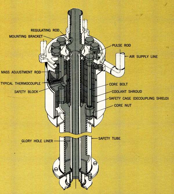 Following a pulse, additional reactor shutdown capability is provided by a safety block which, when ejected from the core, reduces the reactivity to about 20 dollars below delayed-critical. At lower yield pulses, below about 6 × 10¹⁶ fissions, the safety block is ejected by [Pg 8] the electro-mechanical scram system in about 0.1 seconds after a pulse. At higher yield pulses, the safety block is ejected in much shorter times due to thermo-mechanical shock forces which cause the safety block to bounce out. The large shutdown margin provided by the safety block is also the primary design device for preventing accidental criticalities during periods of reactor shutdown.