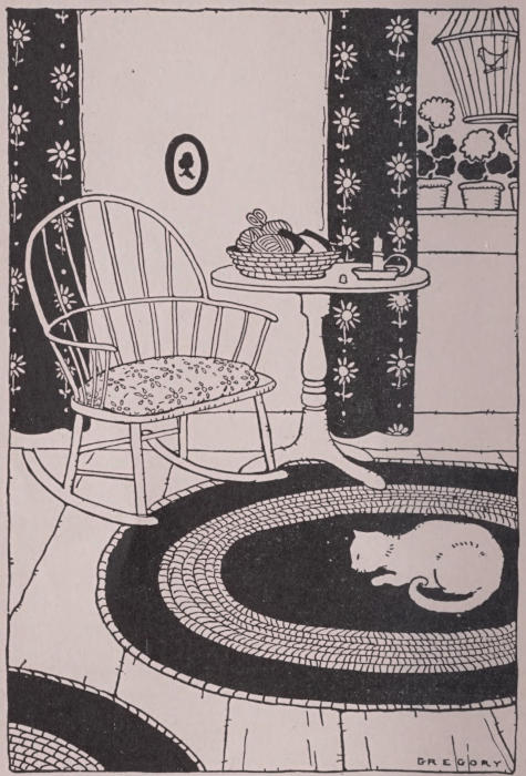 Grandma opened the door immediately and the children stepped in—then stared in astonishment. They had never seen a room like this before. In place of the blue rug was a gayly colored rag carpet. The bed, to which had been added a feather tick, was twice as high as any they had ever seen. It was covered with a handmade coverlet of blue and white. Patchwork cushions were on the chairs, and crocheted covers on bureau and chiffonier. The windows were filled with blooming geraniums, and in one window hung a canary in a gilt cage. On a round braided rug before the fire lay a gray cat, asleep. By a low rocker stood a little table that held a work basket running over with bright-colored patches, bits of lace, balls of scarlet yarn, knitting needles, pieces of velvet, silk, and wool. On the chiffonier stood a basket filled with big, red apples, polished till they shone, and beside the apples was a plate covered with a napkin.