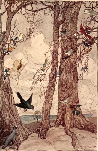 Just then the cardinal-bird darted out of the honeysuckle and flew ahead of them, and in an instant a brilliant bluebird followed him.