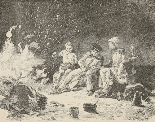 When the time came for “turning in” Joe spread his water-proof blanket on the sand close by the side[151] of his canoe. He had dragged her several yards away from the rest of the fleet, so as to be able to make his bed on the highest and driest part of the sand, and to shelter himself from the wind by lying in the lee of his boat. The other boys preferred to sleep in their canoes, which were placed side by side and close together. The blazing logs made the camp almost as light as if the sun were shining, and the boys lay awake a long while talking together, and hoping that the wind would die out before morning.