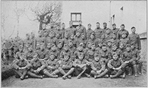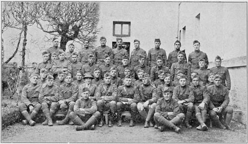 The winter wore on, and spring was upon us, and we seemed no nearer France than before. Changes took place in officers as well as enlisted men. Lt. Ashmore went to “A” Co.; Lt. Fish to the Supply Co.; 2d Lts. Dunn and Merrill and 1st Lt. Vanderbilt took their places with “B” Co. The time was filled with training and equipping the ever changing quotas of recruits and drilling them in fundamentals; for the training cadre of officers and N. C. O.’s there were special courses in bayonet fighting, bombing, trench digging—how many cold and weary hours were swallowed up in that trench system east of the regimental area!—and ever and always wind, mud and snow, or wind, sun and dust.