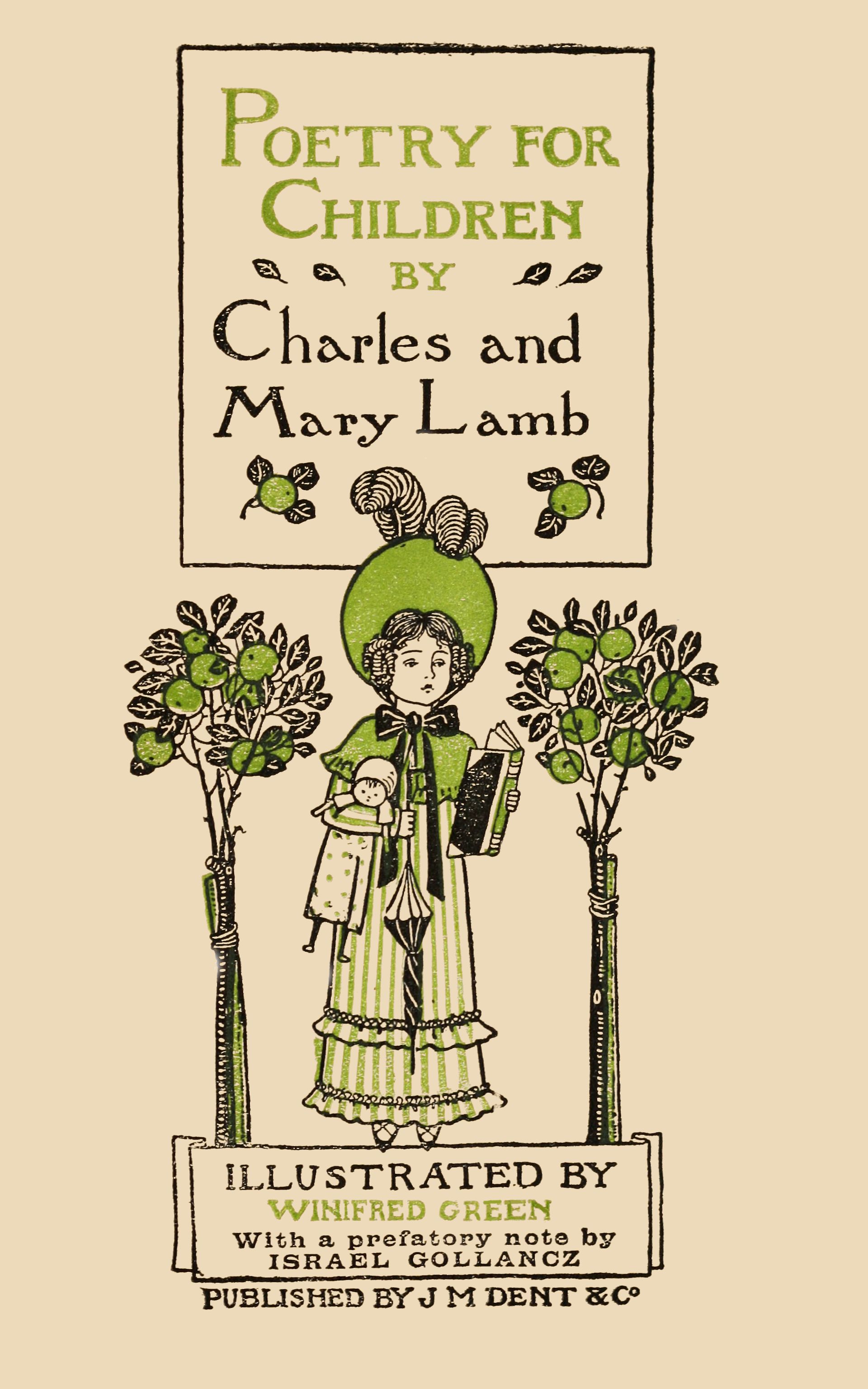 Mary Lamb had something of her brother’s gift of writing; it was she indeed to whom you owe many of the Tales of Shakespeare you are so fond of. They loved children, and they loved Shakespeare, and their stories from Shakespeare have been and are still read by boys and girls all the world over. They wrote, too, a whole collection of Poetry for Children, and here also Mary’s share was much greater than her brother’s. “Mine,” wrote Charles, “are but one-third in quantity of the whole.” ... “Perhaps5 you will admire the number of subjects, all of children, picked out by an old bachelor and an old maid. Many parents would not have found so many.” This collection of “Poetry for Children” in two small volumes, was so much liked by the children that all the copies were soon bought up, and Charles Lamb himself could not get a copy, when later in life he sought one far and wide. So rare is the book now that only one or two copies are known to exist, and even the British Museum does not possess these precious little volumes. A small selection of the poems are now once again offered to boys and girls: if this prove welcome, more will follow. They are simple little poems such as children should care for, and even grown-up people, for whom they were never intended, cherish every word written by Mary and Charles Lamb, because they know how much goodness and humility dwelt in their souls. If there were any wish to be learned and to explain how they came to write these verses, one would have to tell you something about other writers who were then living and writing, more especially about Lamb’s friend “S. T. C.,”6 who, together with an even greater poet, William Wordsworth, had published ten years before, in 1798, a small volume of simple English poems, which was destined to have the greatest influence on English poetry for long years to come. In that volume Wordsworth first printed the sweet little poem I am sure you know, called We Are Seven, and Coleridge, “the inspired charity boy,” as Charles Lamb called him, gave the world the magical ballad of The Ancient Mariner. One verse from this ballad ought to be printed on the title-page of this little book of poems by Mary and Charles Lamb:—