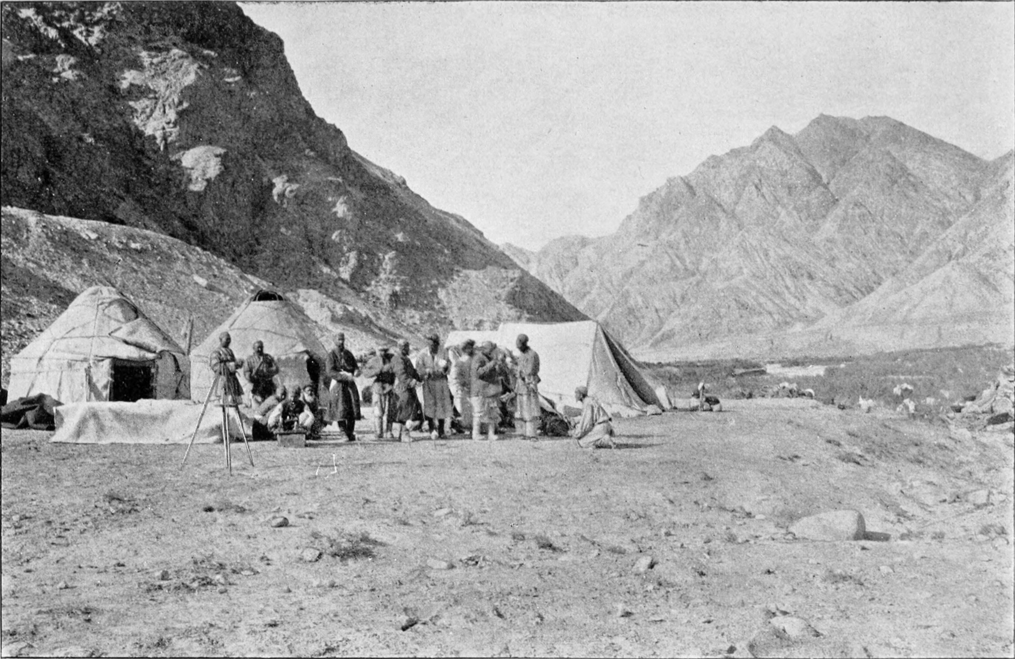 Der Zug weiter durch das Tal hinunter war nicht leicht. An ein paar Stellen, wo der Granit mehrere Meter hohe Stufen in der Rinne[S. 391] selbst bildete, mußten alle Tiere abgeladen und dann vorsichtig an den Platten hinuntergelassen werden. Einmal überschritten wir eine gewaltige Eistafel, die den Talgrund wie gegossenes Porzellan ausfüllte und sich allen Spalten und Ritzen anschmiegte. Ihre glatte Oberfläche mußte erst mit Sand bestreut werden, damit die Pferde nicht fielen. Es war wirklich schön, diesen von Blöcken und Schutt angefüllten Hohlweg hinter sich zu haben und wieder in das Tschimental zu gelangen, wo wir an der Stelle lagerten, an der wir vor einem Monat mit der Hilfskarawane zusammengetroffen waren.
