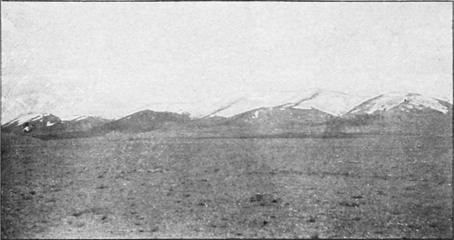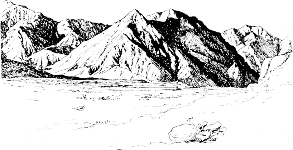 Beim nächsten Lagerplatze fanden wir in den harten, gefrorenen Büscheln der Hochlandsteppe gutes Brennmaterial, und der Schnee schenkte uns Wasser. Am folgenden Morgen vergoldete die Sonne die Gipfel des Illwe-tschimen, während wir noch im Schatten lagen; es wehte nicht, wir sehnten uns in den Sonnenschein hinaus und waren bald im Gange. Von dem obenerwähnten Gebirgsstock geht ein Tal aus, dessen Gehänge außergewöhnlich gute Weide tragen. Daher blieben wir hier nach einem kurzen Tagemarsch, und ich war gerade dabei, das Stativ des Theodoliten aufzustellen, als der Weststurm kam und jeder Arbeit im Freien ein Ende machte. Er riß das Zelt der Leute um; es flog fort und landete auf dem Eise des Talgrundes.