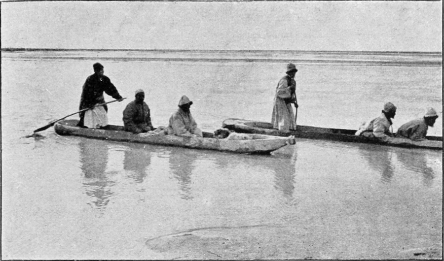 Am Morgen des 18. November wurde das Boot (Abb. 164) zu einer Fahrt über die salzigen Tiefen des Ajag-kum-köll instand gesetzt (Abb. 165).[S. 385] Es wurde von Tokta Ahun gerudert und trug eine bedeutende Last, denn wir nahmen außer Segeln, Rudern, Rettungsbojen, Tiefenlotungsapparaten und Instrumenten auch Proviant für zwei Tage, nämlich Fleisch, Konserven, Brot und Kaffee, ferner Geschirr zum Bereiten der Speisen, eine Tschugun (Kupferkanne) mit Wasser und einen kleinen Beutel mit Eisstücken mit. Schließlich versahen wir uns auch mit Pelzen und Filzdecken; so war der Raum in dem kleinen Fahrzeug überall besetzt. Ich peilte ein für allemal ein kleines vorspringendes Vorgebirge im Südwesten ein, auf das wir in gerader Linie zusteuerten. Das Wetter war herrlich, der See lag ruhig und still, und nur eine kaum merkbare Dünung bewegte seine Fläche.
