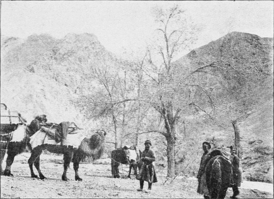 Der Hauptpaß, der uns über den Tschimen-tag selbst führte, war sehr bequem und bestand aus weichen, abgerundeten Hügeln ohne anstehendes Gestein. Auf seiner Südseite gelangten wir in dasselbe Längental, das wir im Juli weiter oben im Osten gekreuzt hatten. Unweit des Lagers heißt die Gegend Att-attgan (das erschossene Pferd), weil dort ein Jäger, der längere Zeit Pech gehabt hatte und am Verhungern gewesen war, schließlich sein Pferd hatte erschießen müssen, um Fleisch zu bekommen. Unser Lagerplatz am Flusse heißt Mölle-koigan (der fortgeworfene Sattel), weil er hier seinen Sattel im Stiche gelassen hatte.