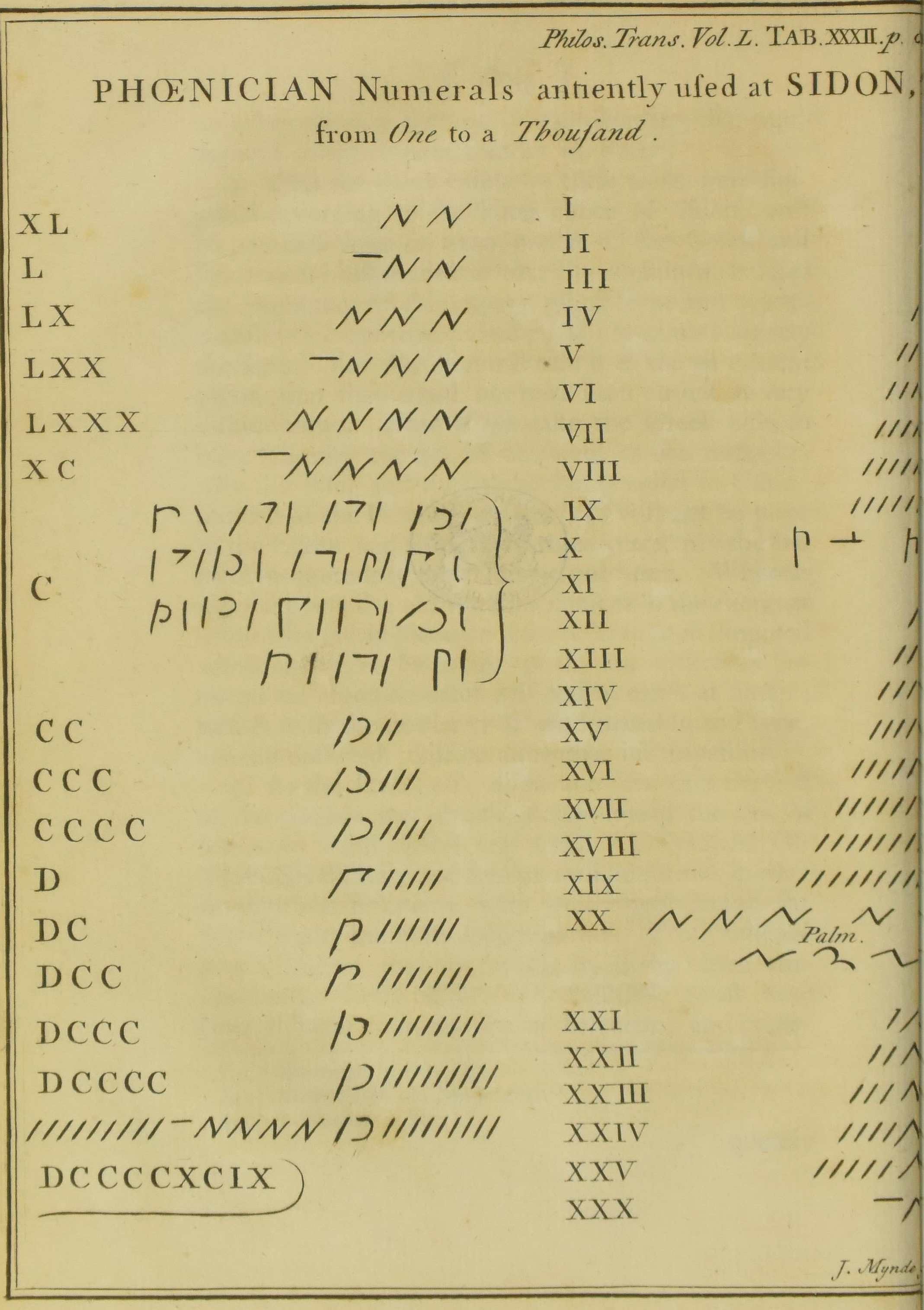 [210] It may not however be amiss to remark, that most of the forms of the Phœnician centenary and decimal numeral characters rather resemble the correspondent Palmyrene numerals of Gruter than those of Mr. Dawkins; as will be obvious to every one, who shall think proper to compare all those different characters one with another. Philosoph. Transact. Vol. xlviii. Par. ii. p. 721, 741.