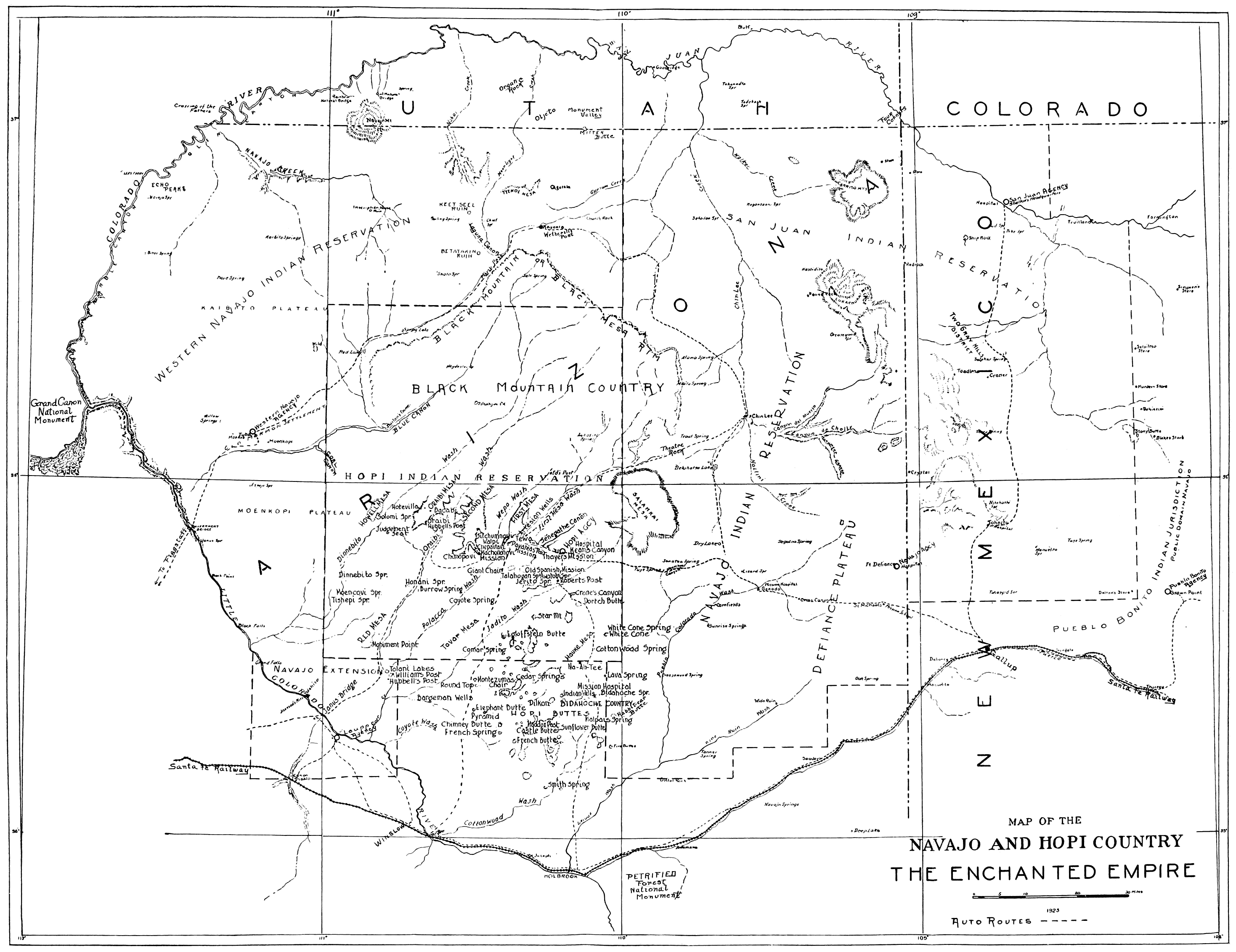 those people of the Enchanted Desert who called me “Chief,”—Indians, employees, missioners, traders,—whose confidence, loyalty, and devotion made my work among the Hopi and Navajo tribes possible of success; and to humbler friends, my faithful horses, Dandy and Barney Murphy, Prince and Frank, that went with me so many weary miles, and were shot, by my order, to save them from the miseries of Governmental economy, this book is dedicated. [vii]