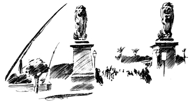 in Egypt. My carriage went between the two bronze lions and joined in the procession of camels across the bridge over the famous river to the Gizeh side, where tall trees meet overhead; then to a smaller bridge, more trees, quaint shipping, and a stucco palace, once a harem where some of Ismail’s wives lived, and now a museum, the temporary resting-place of those uneasy mummied heads that once wore Egypt’s crown; small mouse-colored