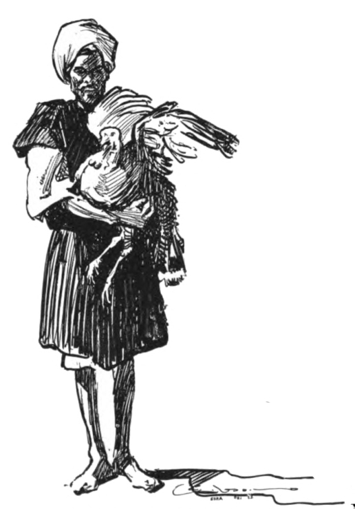 By two o’clock we reached Assuan, and moored to the island of Elephantine, just opposite the town, from which any number of little bright-painted ferry-boats rowed toward us; and in a few minutes some thin-legged Egyptian policemen and a few natives were on the bank, and a small boy with a stick had been selected to mind the turkeys that we had brought from Esneh. Some of the poor birds were very weak on their legs, and where they ought to have been red they were only a pale salmon-color; but the little cook promised that they would be all right in a day or two. Some of the crew had homes on the island, and they all put on their best clothes and were met by friends. They immediately established a laundry on shore, and{79} the building of an oven proved that we were to be there for some time.