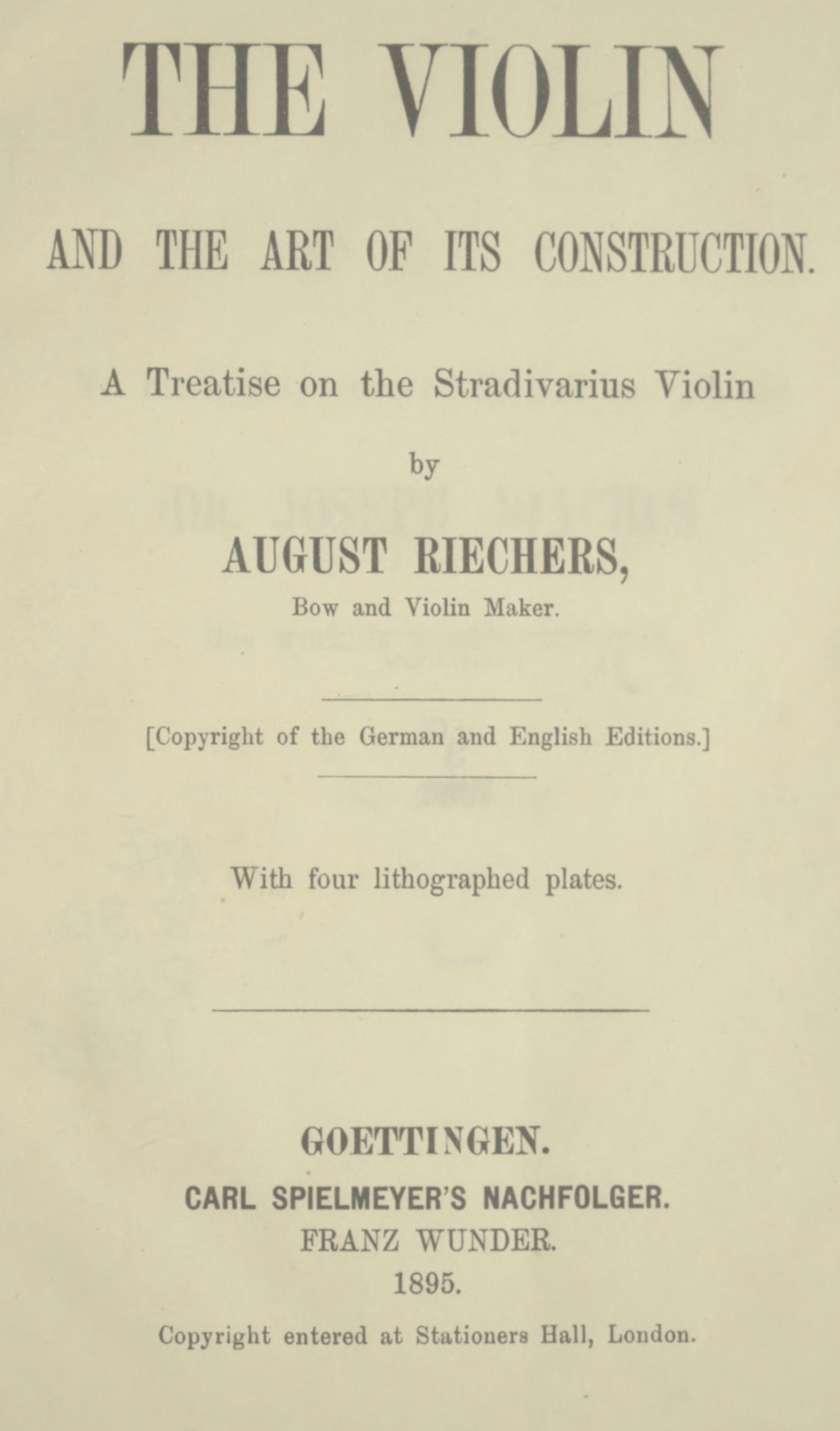 The highly esteemed author of this treatise, a renowned violin maker and clever repairer, of old instruments, having been denied the pleasure of publishing the same himself, death intervening on January 4th, 1893, his work on the violin and the art of its construction is now published, in accordance with his last wishes.