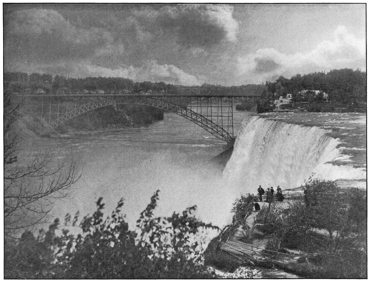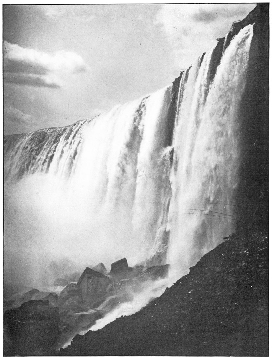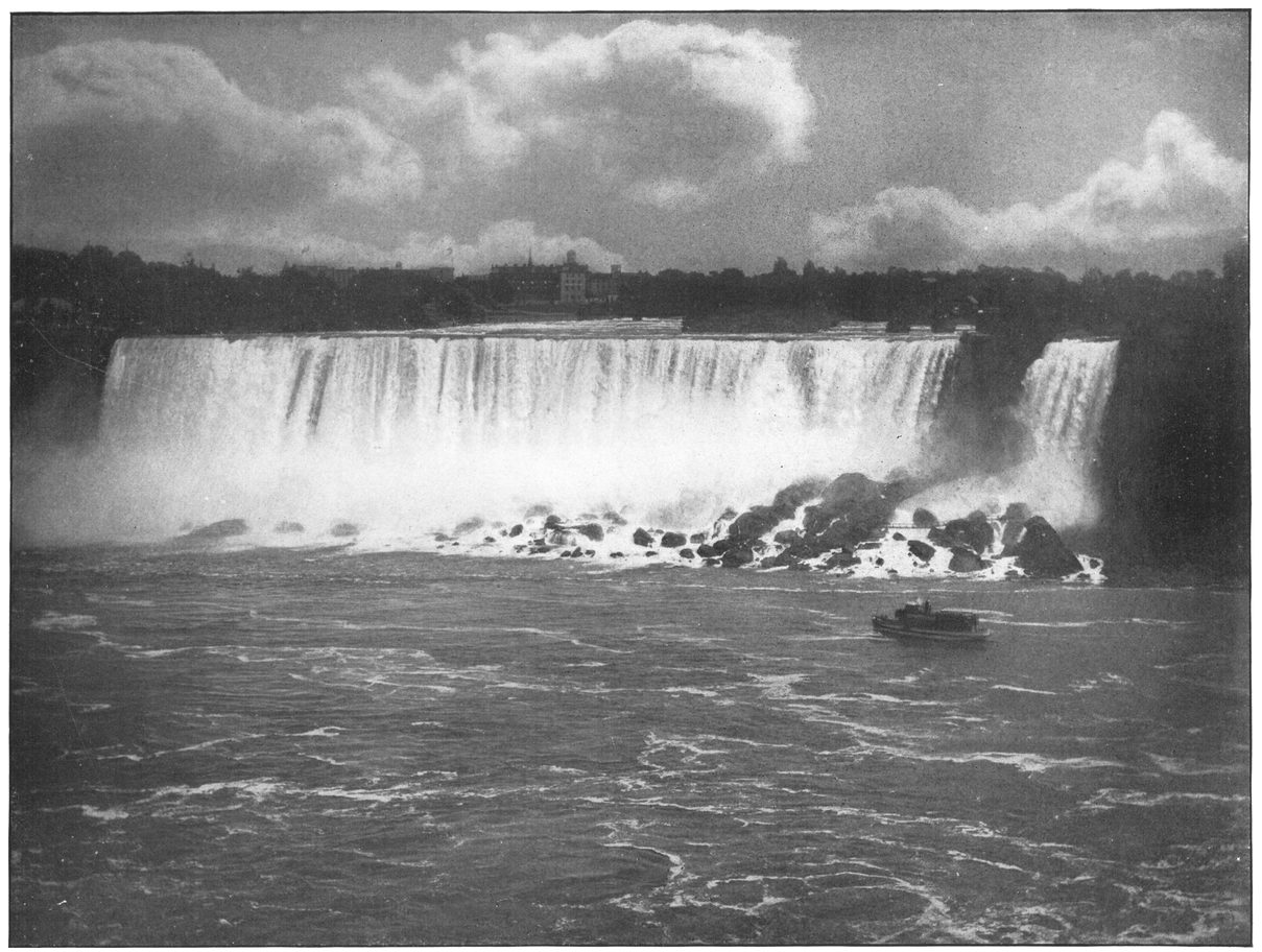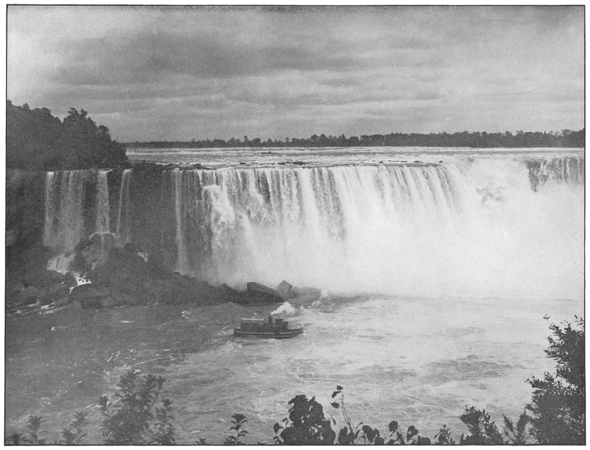Favorite positions for this view are Hennepin View in Prospect Park and the New Steel Bridge. At the left is the American Fall with Luna Island and Goat Island dividing it from the Horseshoe Fall. The Maid of the Mist, near her landing, and the inclined railway are minor objects of interest.