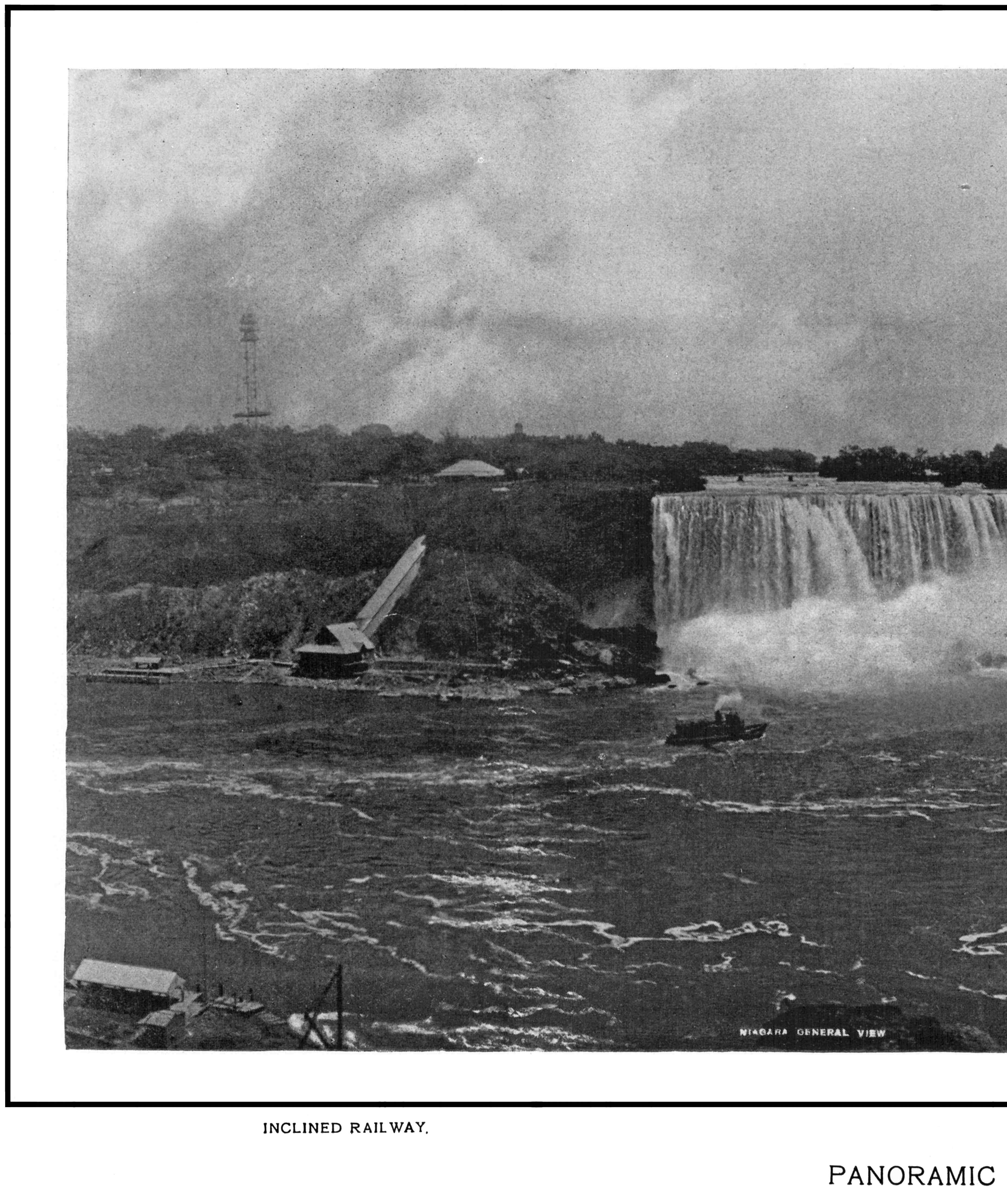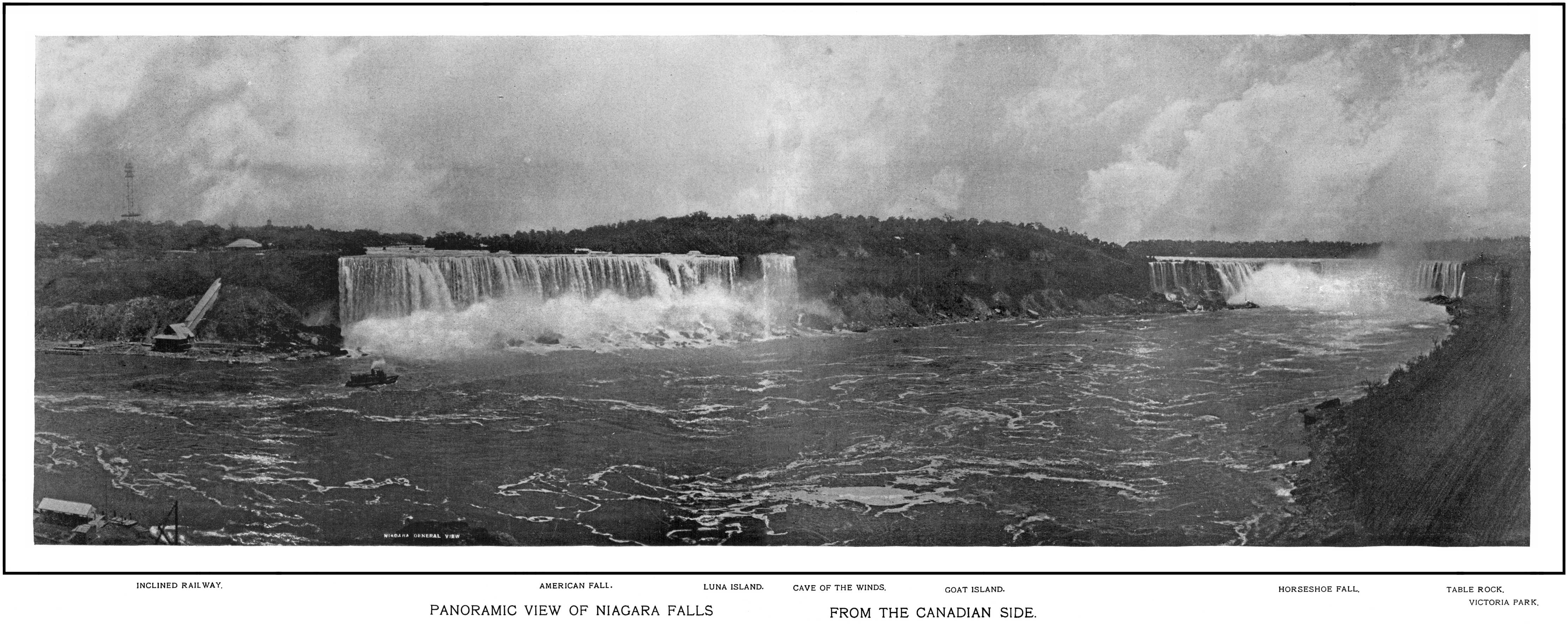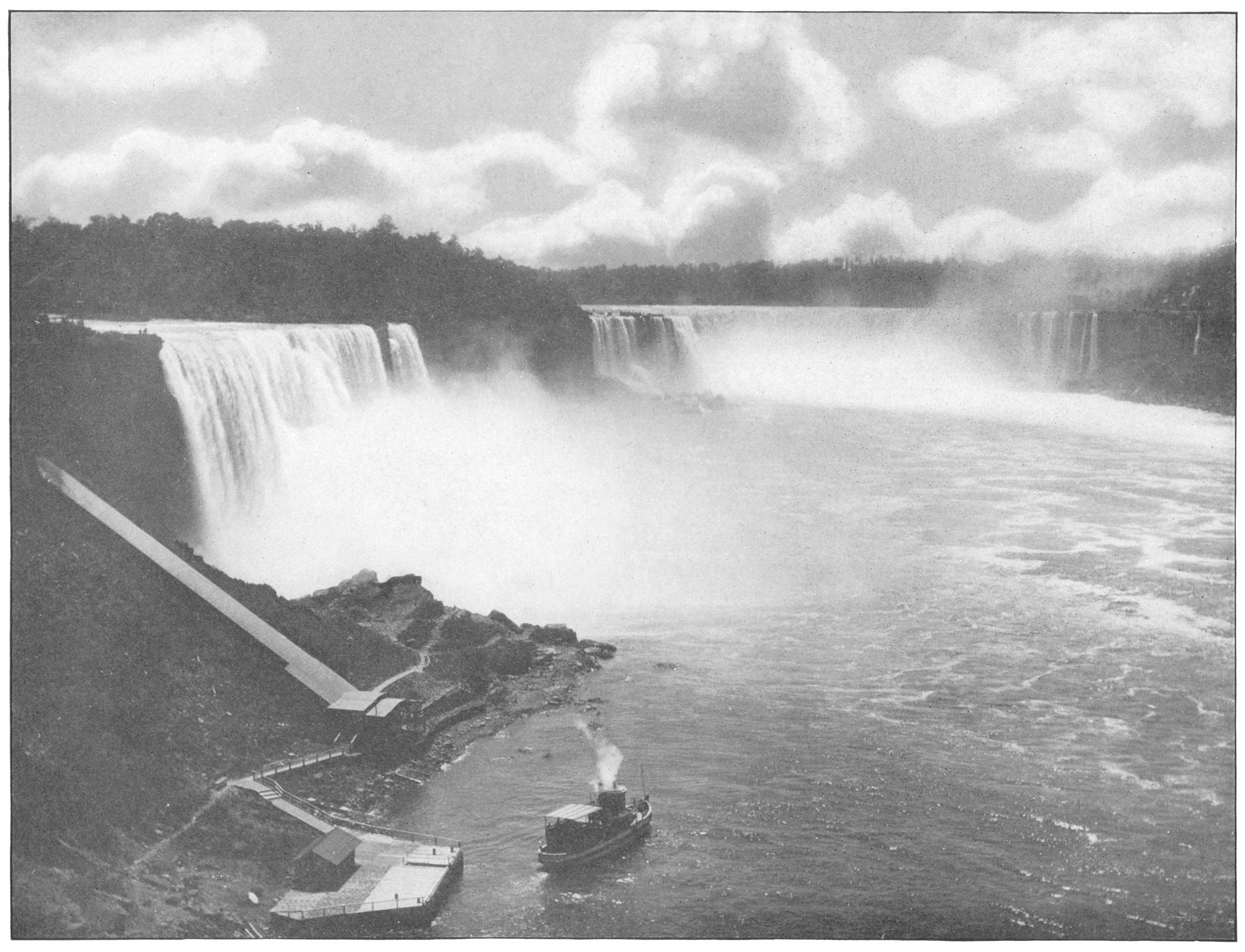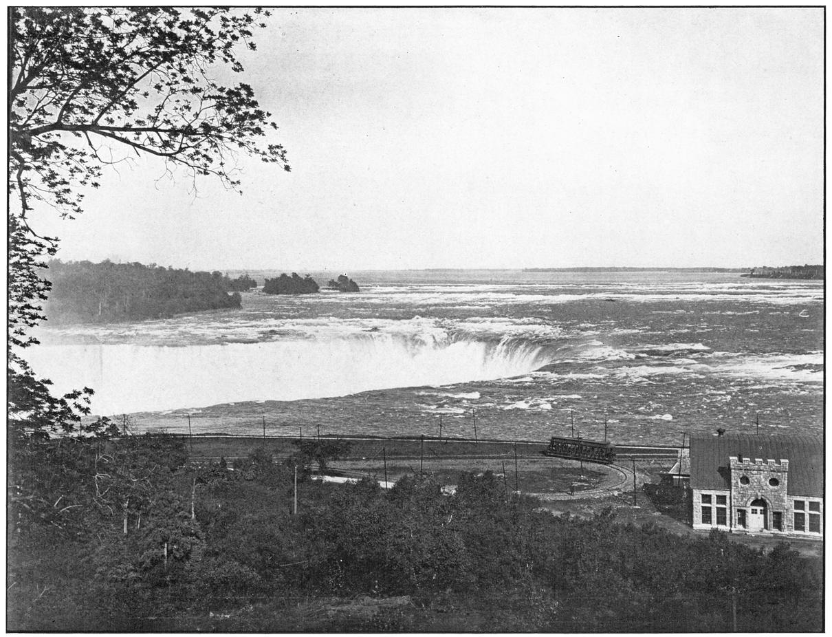 Favorite positions for this view are Hennepin View in Prospect Park and the New Steel Bridge. At the left is the American Fall with Luna Island and Goat Island dividing it from the Horseshoe Fall. The Maid of the Mist, near her landing, and the inclined railway are minor objects of interest.