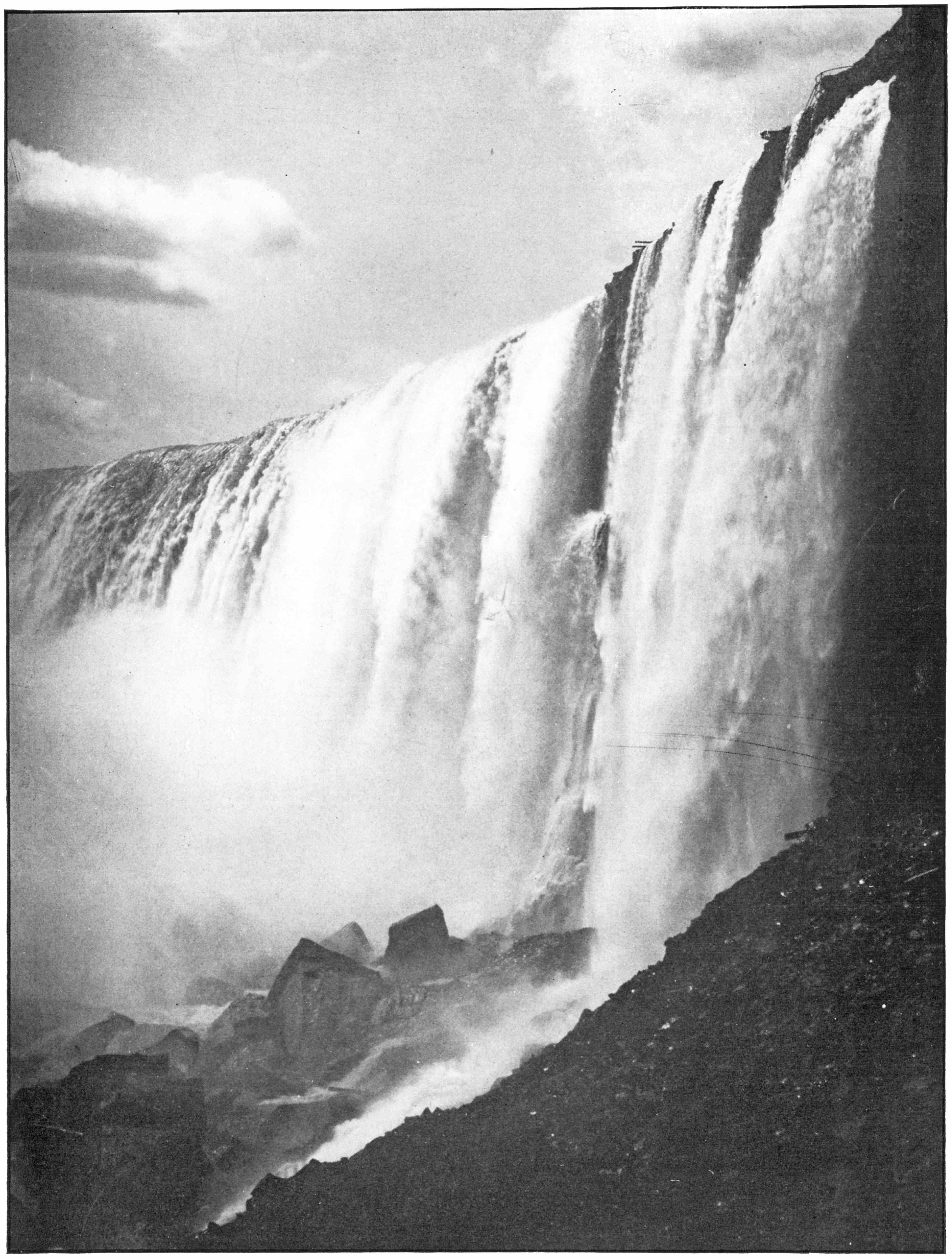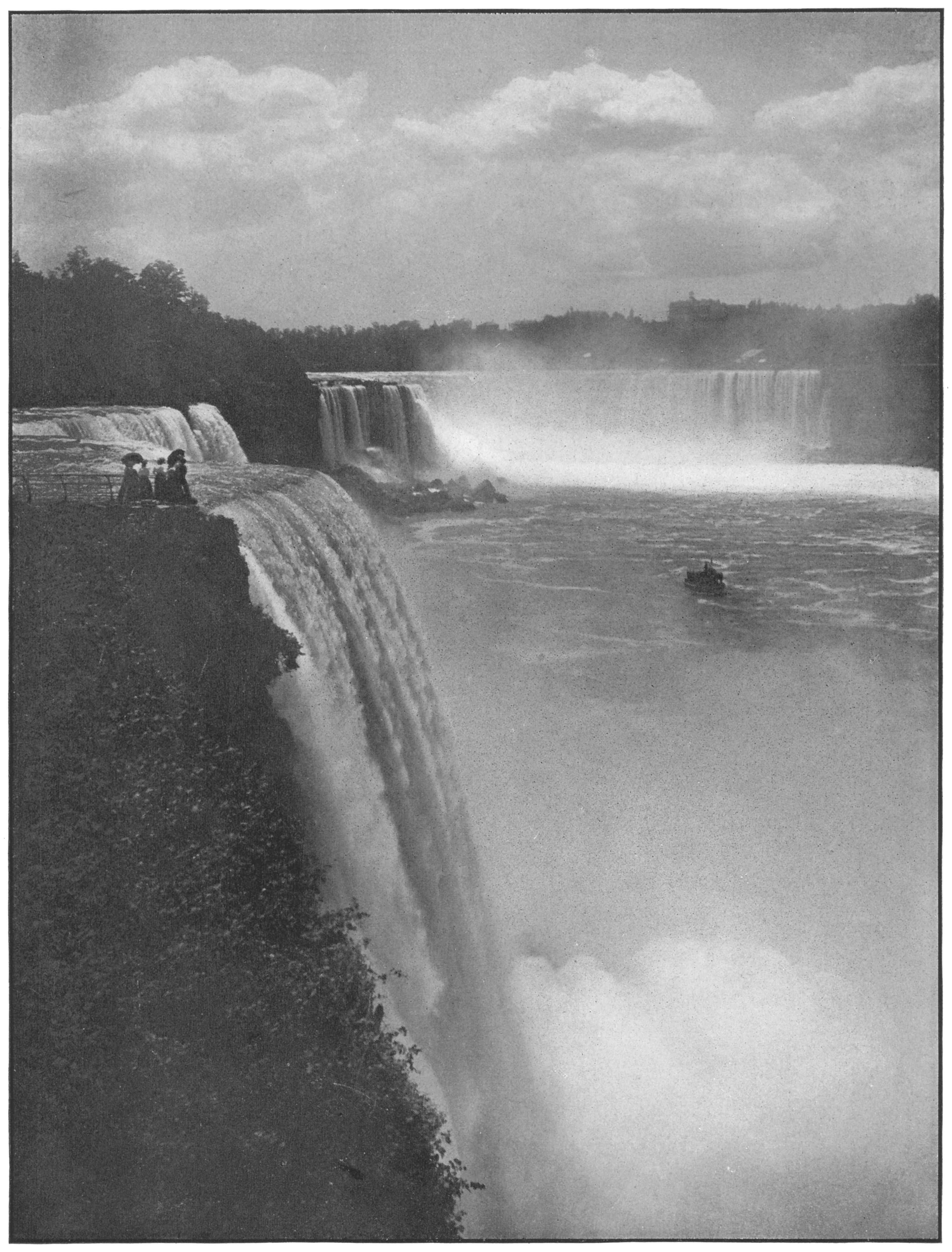 It is while standing at or near Prospect Point that the very large majority of people who visit Niagara get their first view of the wondrous cataract. At one wide sweep of vision Niagara is before you and you see the water pour over the edge of the precipice, falling with stupendous power on the rocks below.