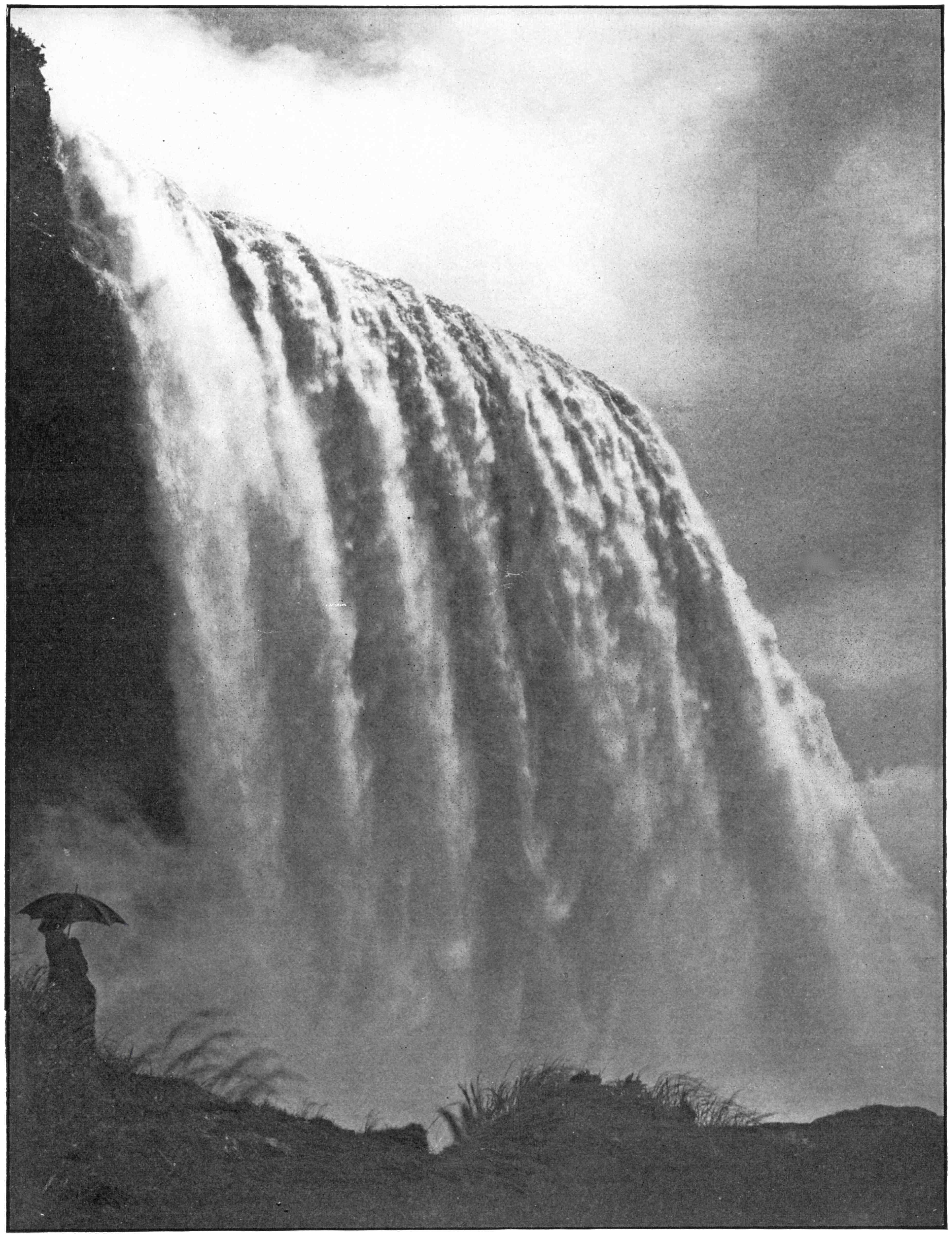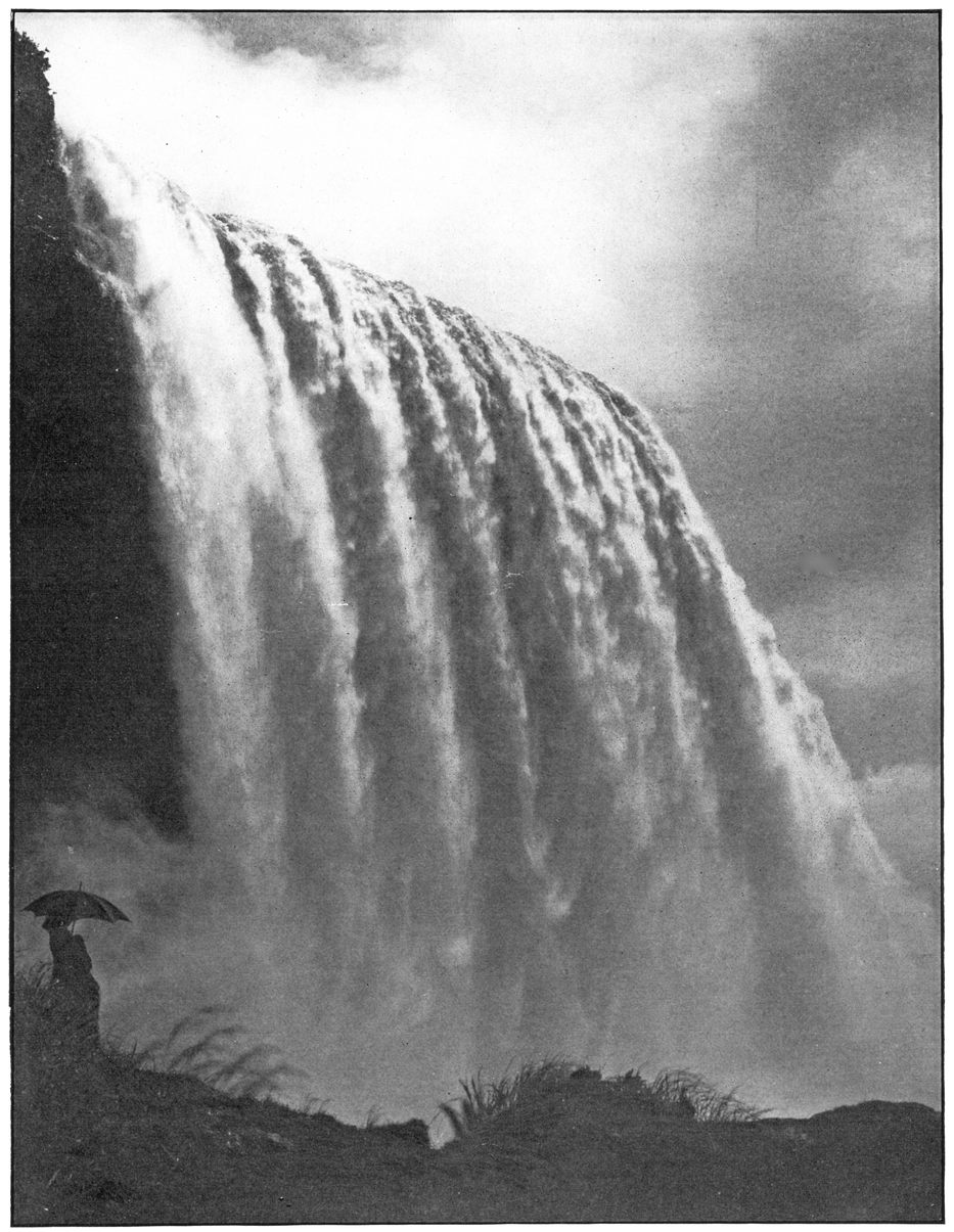 Standing on the rocks at the foot of the Inclined Railway in Prospect Park and looking at the down-pour of water over the American Fall, a new impression of Niagara’s greatness comes over you, and you marvel at the beauty of the mighty flood.