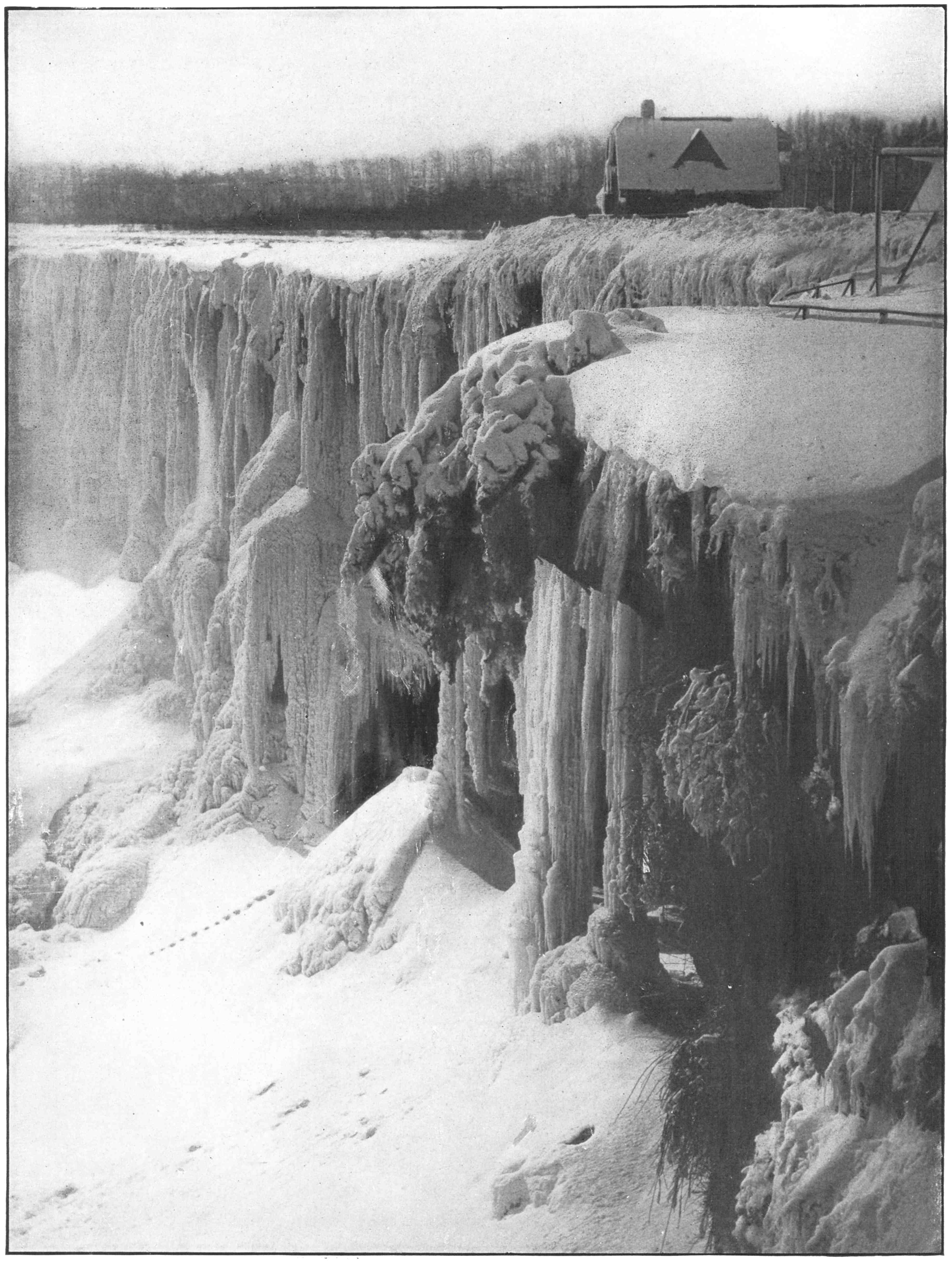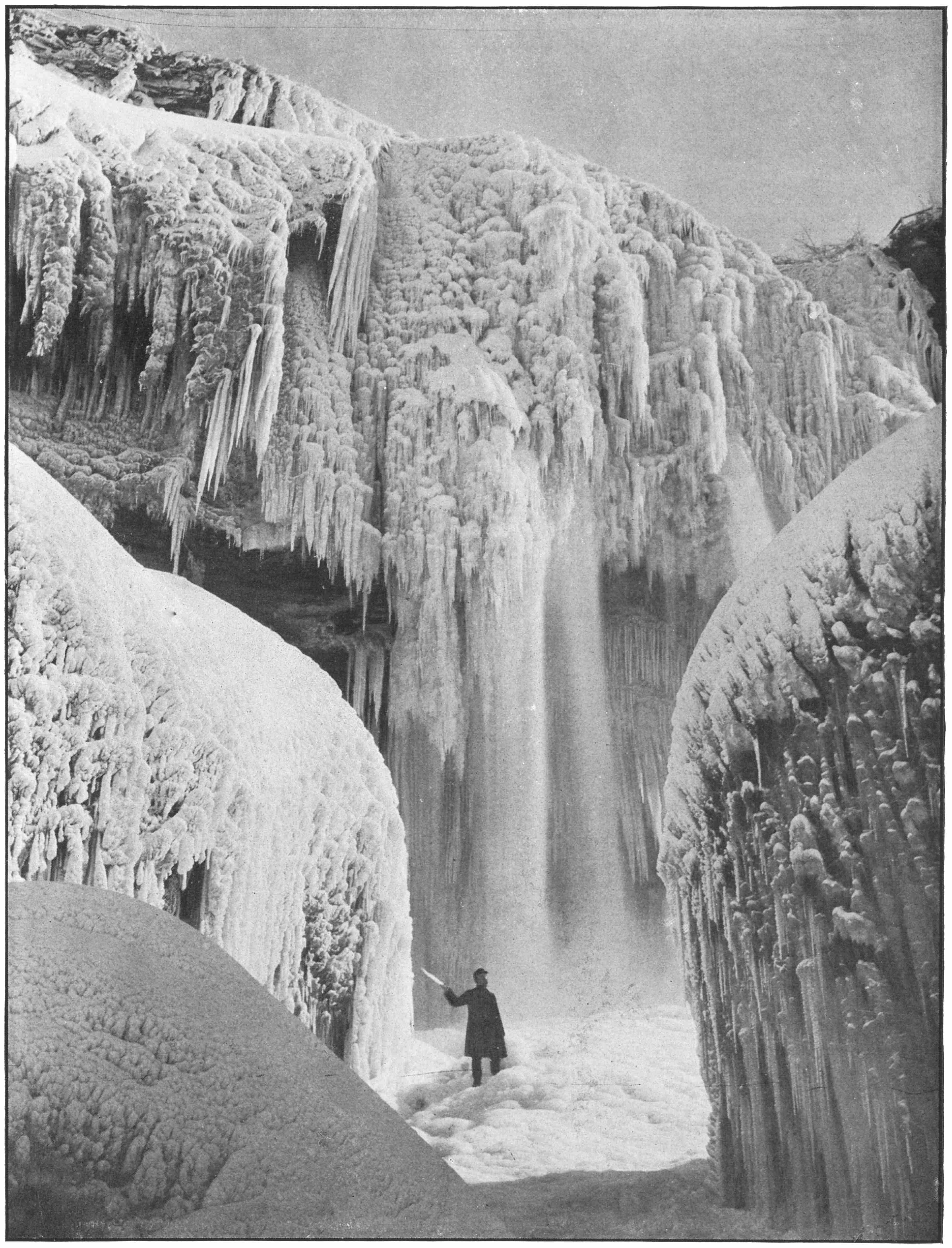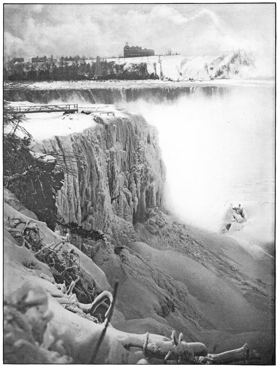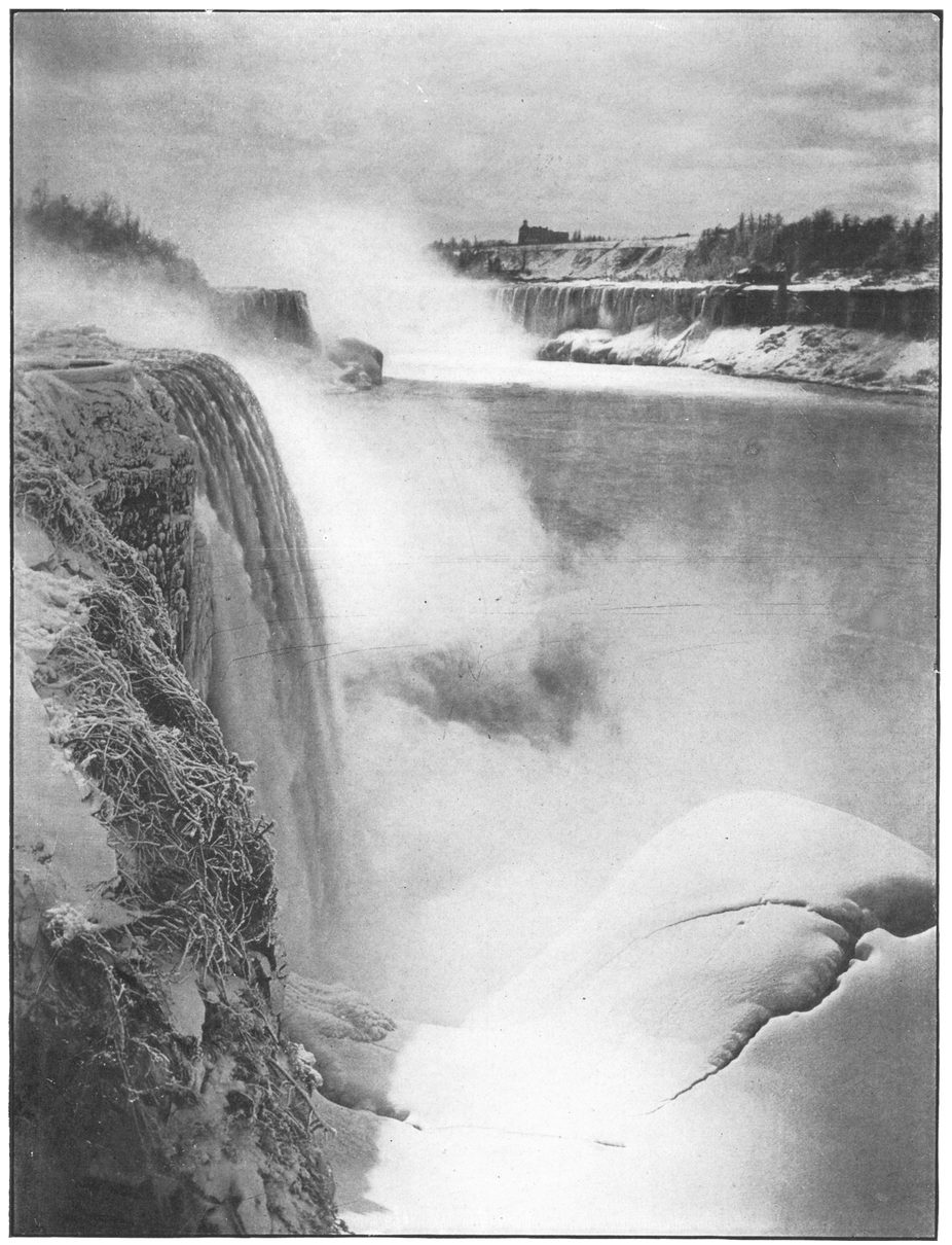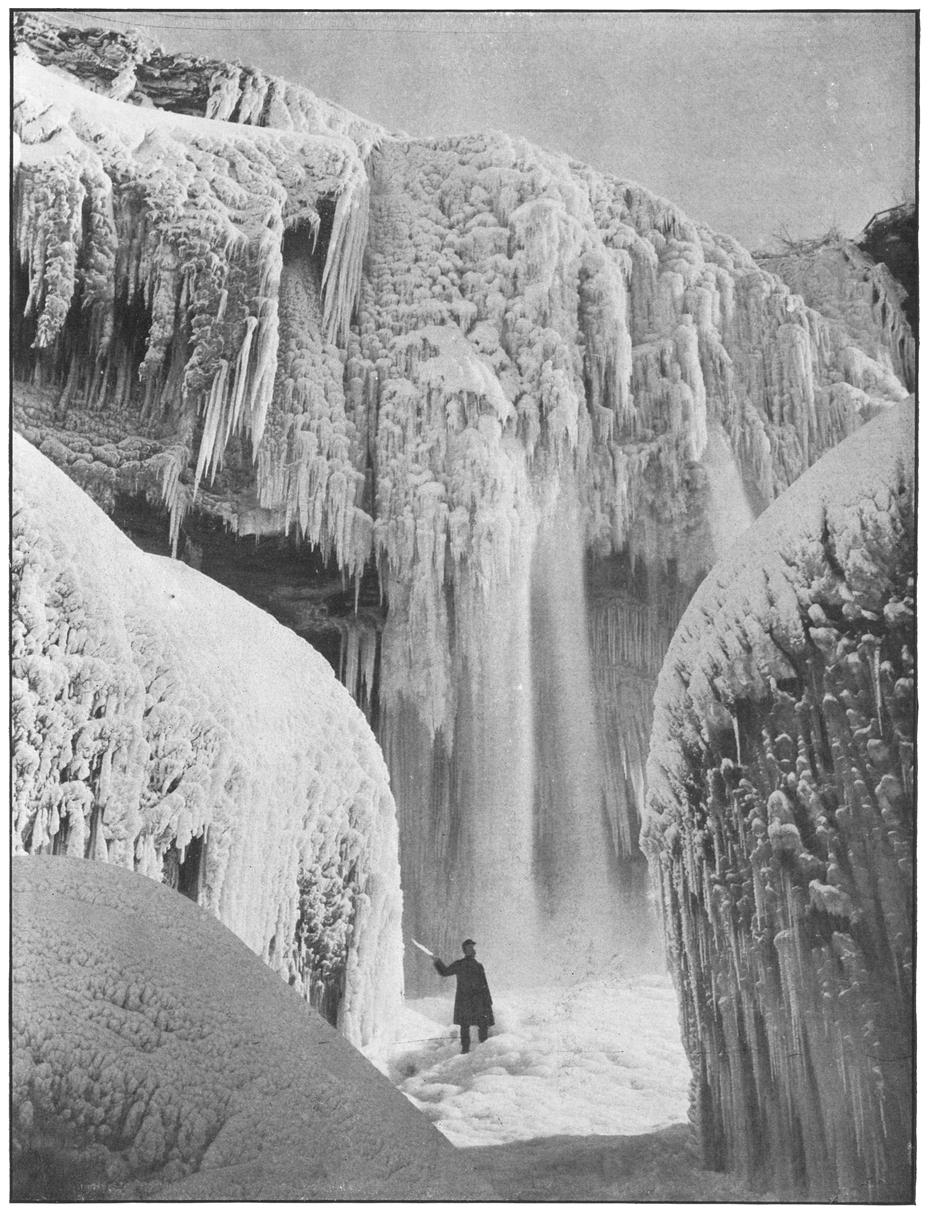 The intensity of the mighty grasp of winter is at no point better portrayed than in its effects on the Horseshoe Fall. Gradually the waters are chilled and frozen until where yesterday the river plunged over the precipice in gleeful, laughing manner, huge stalactites of ice are hung reaching from the cliff-top to the slope below.