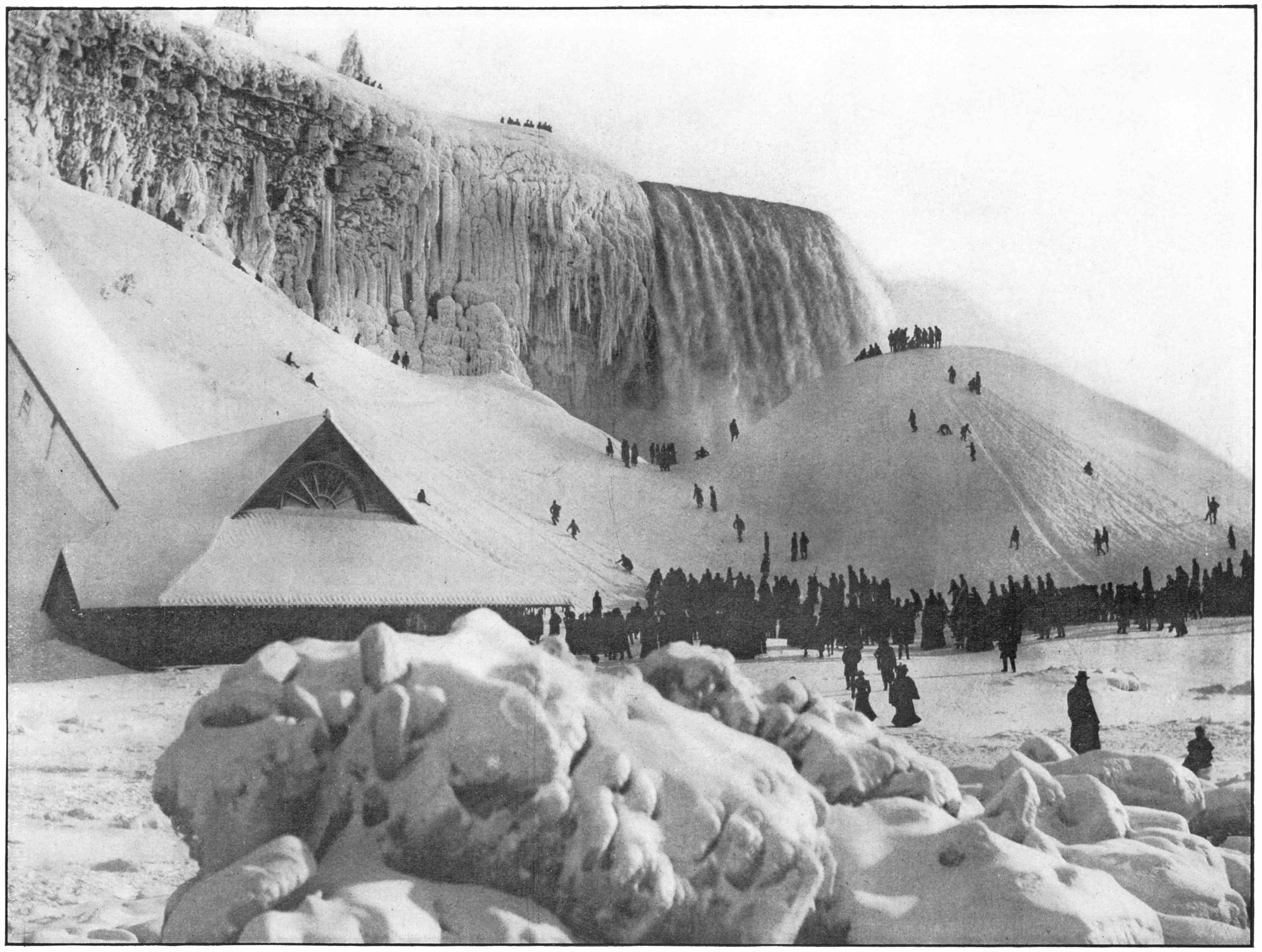 The beauty of this scene varies yearly, for the wind and weather have all to do with the magnitude of the formations. When the weather is exceedingly cold the ice mountain, between the American Fall and the Inclined Railway, attains a magnificent height. The ice also forms from shore to shore, enabling people to pass at will to the Canadian side, and forming what is popularly called the ice bridge.