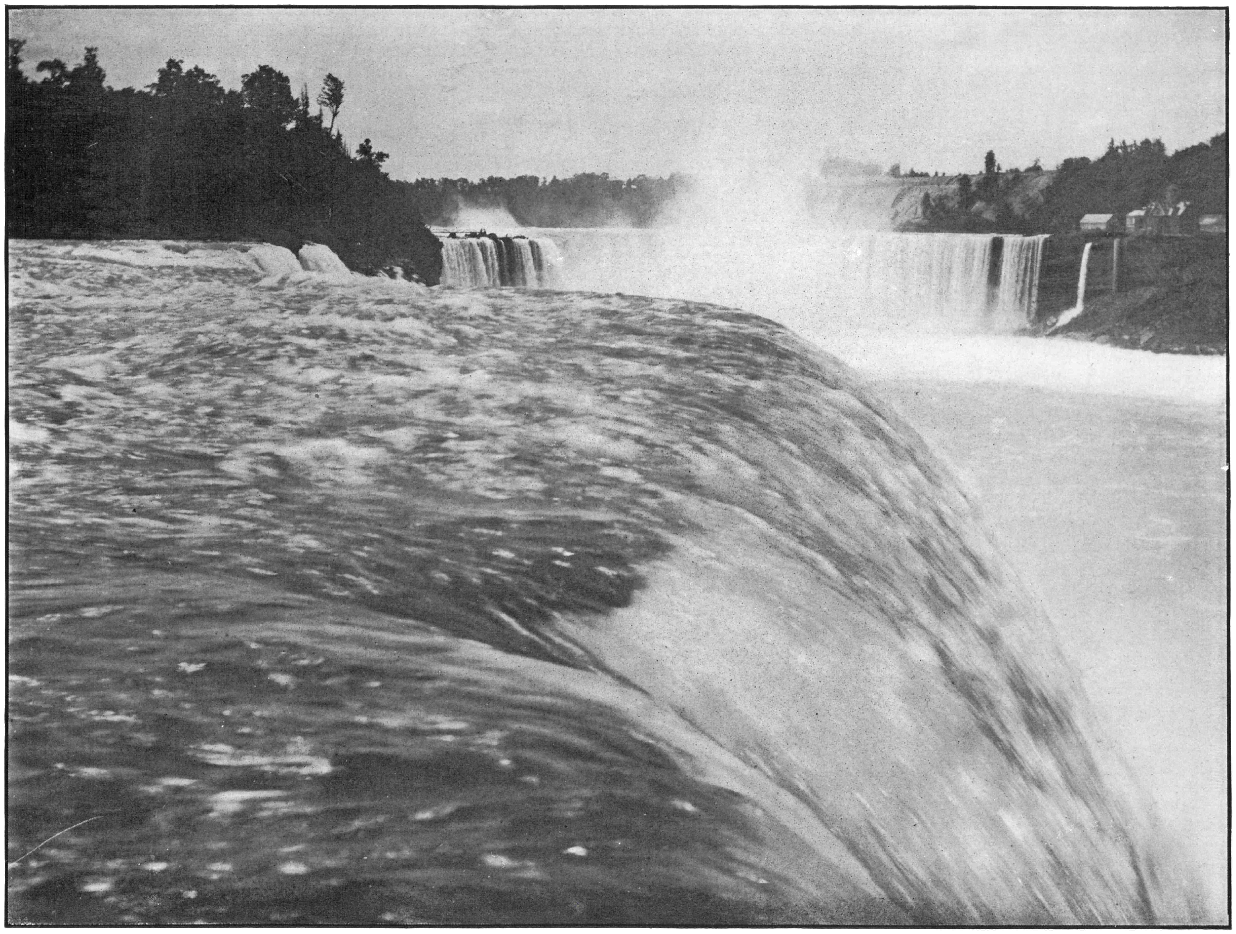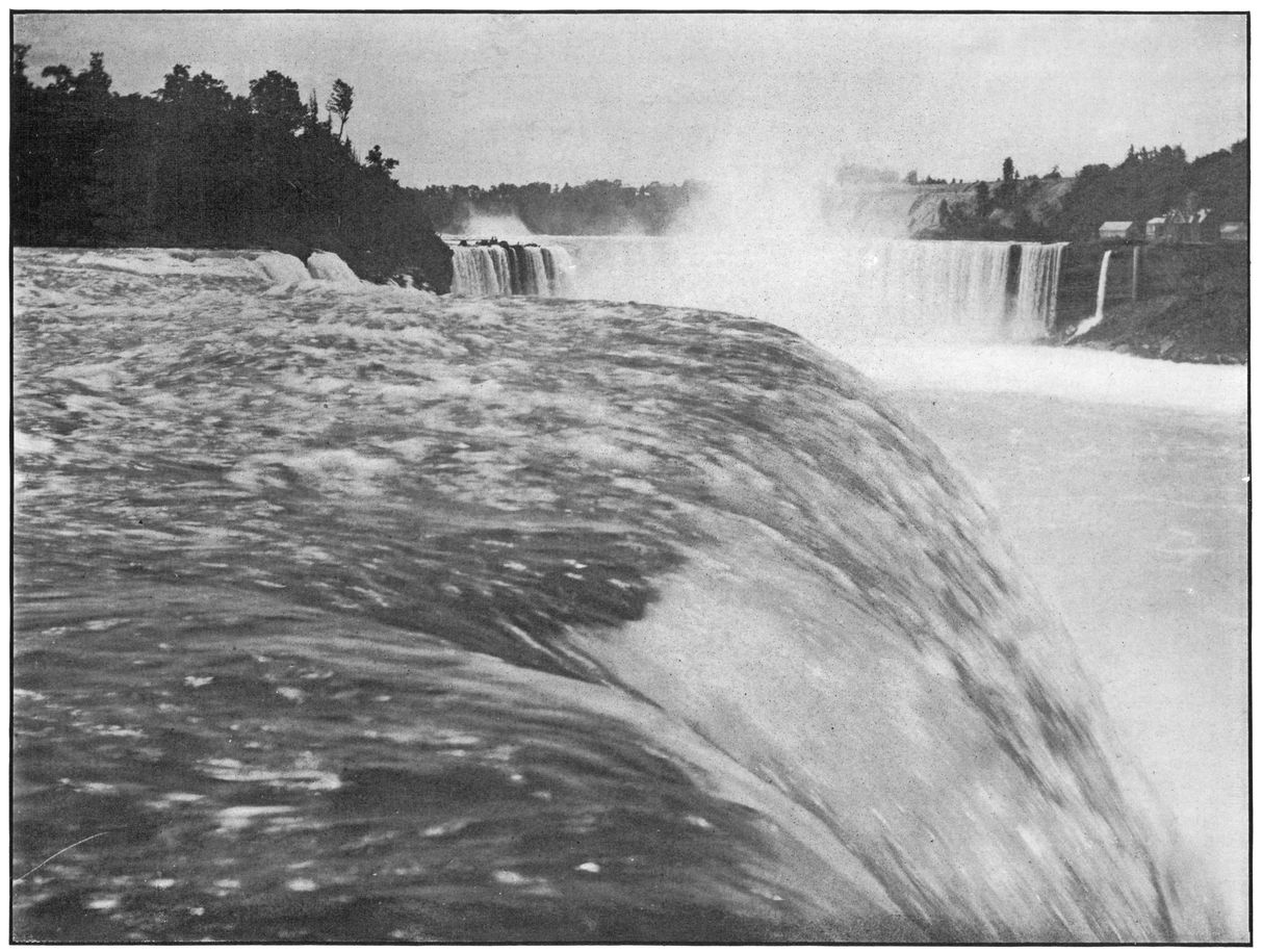Probably there is no one sight which impresses itself more strongly upon the great majority of beholders than this view of the brink of the American Fall. Such mighty on-rushing torrents, so powerful, yet so smoothly and alluringly moving on over the precipice, and so near is the visitor to what seems an abyss of destruction that the scene is never forgotten.