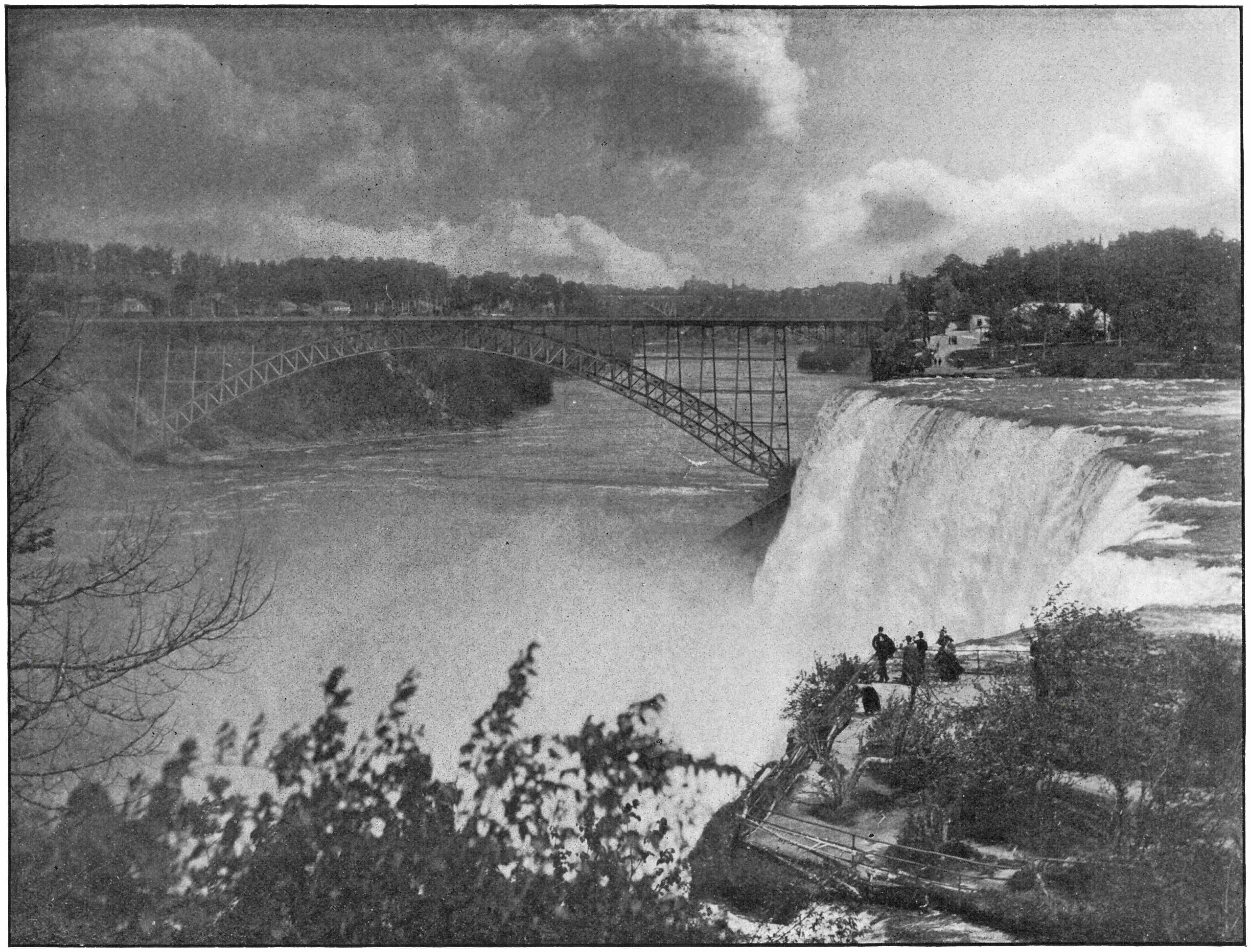 This view across American Fall is one never to be forgotten. Here the brink of the Fall is seen in all its beauty, while far across the Fall, Prospect Park, with its constant crowds, forms part of the picture. A fine view of the Upper Steel Bridge is also here enjoyed.