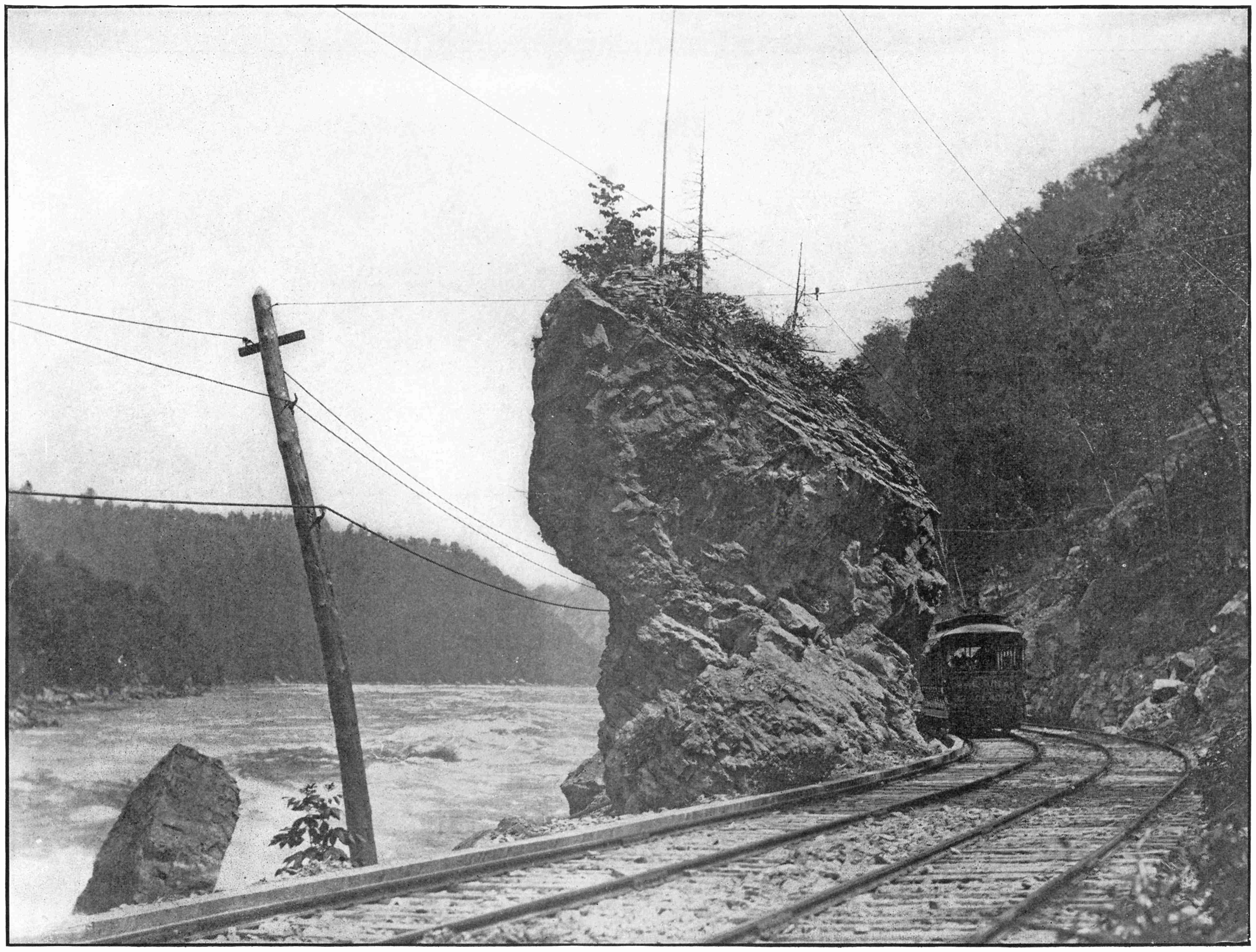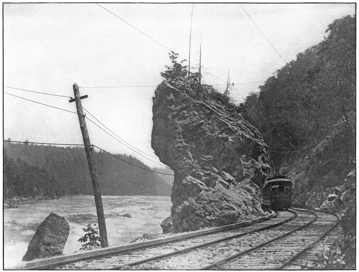 This Electric road runs along the New York Shore, for much of the way, about twenty feet up from the water, and affords unequaled views of the Whirlpool Rapids, the great bridge and cliffs, the Whirlpool and all scenic features. The objects of interest along the Gorge Route are only second to the two great cataracts themselves.