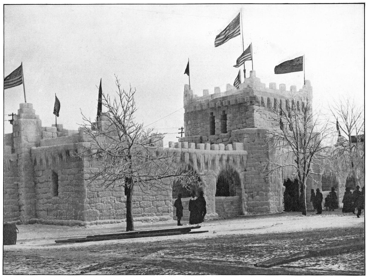 The Ice Palace, a thing of beauty in the production of which man essayed to supplement Nature, was erected in the State Reservation in the winter of 1898. “An area of 120 by 160 feet was covered by its gleaming walls of crystal. The entire structure was gay with bunting and flags by day and brilliant with electrical illumination by night.”