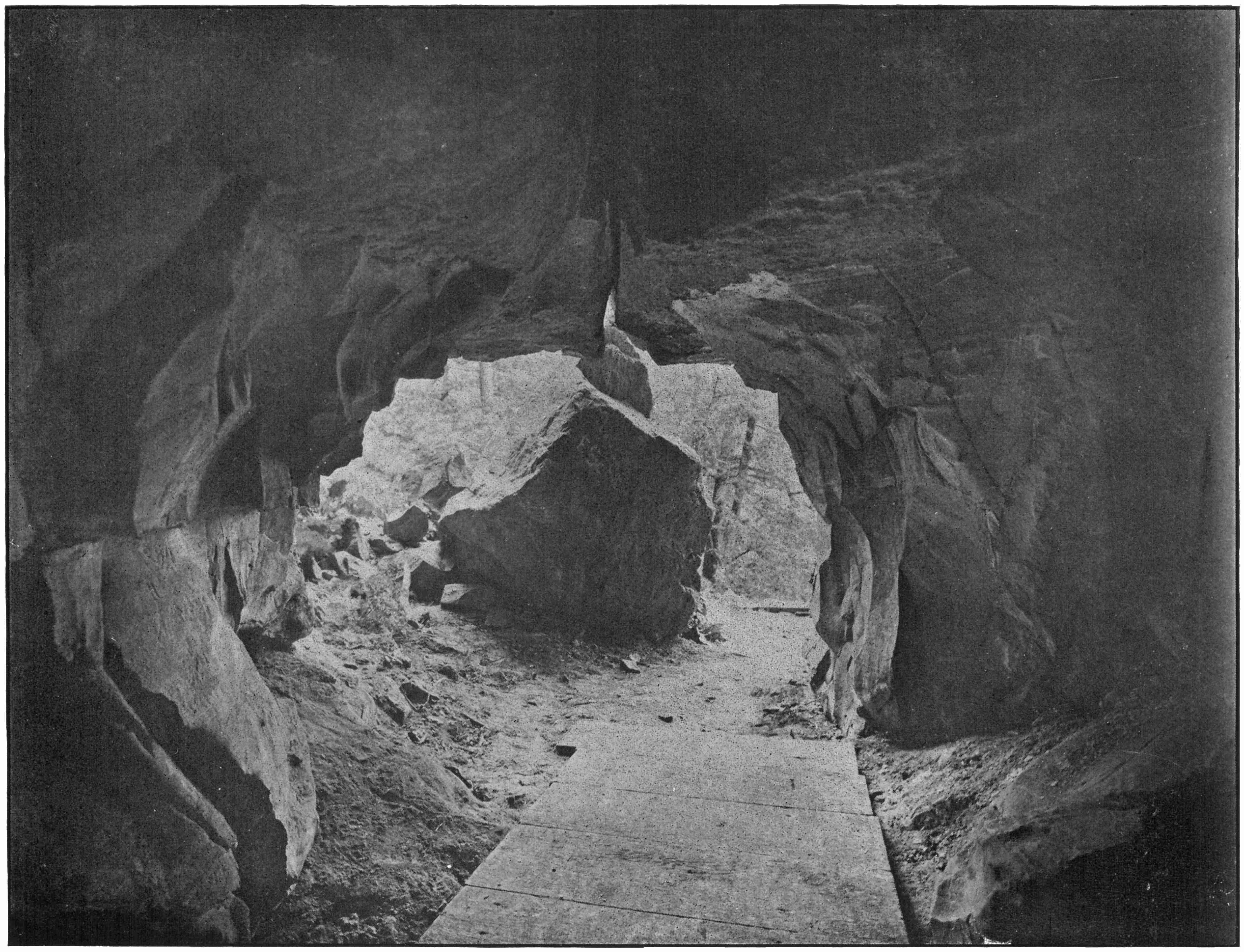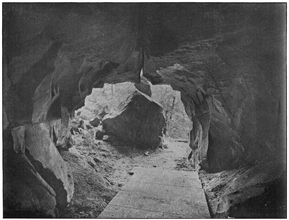In February, 1896, for a period of four days, the Cave of the Winds was dry, the water of the Fall being kept back by the ice formation. Visitors sought the cavern and roamed about admiring the icy scenes on every side. The photograph for the picture above was then made, and it may never be possible to obtain the same again.