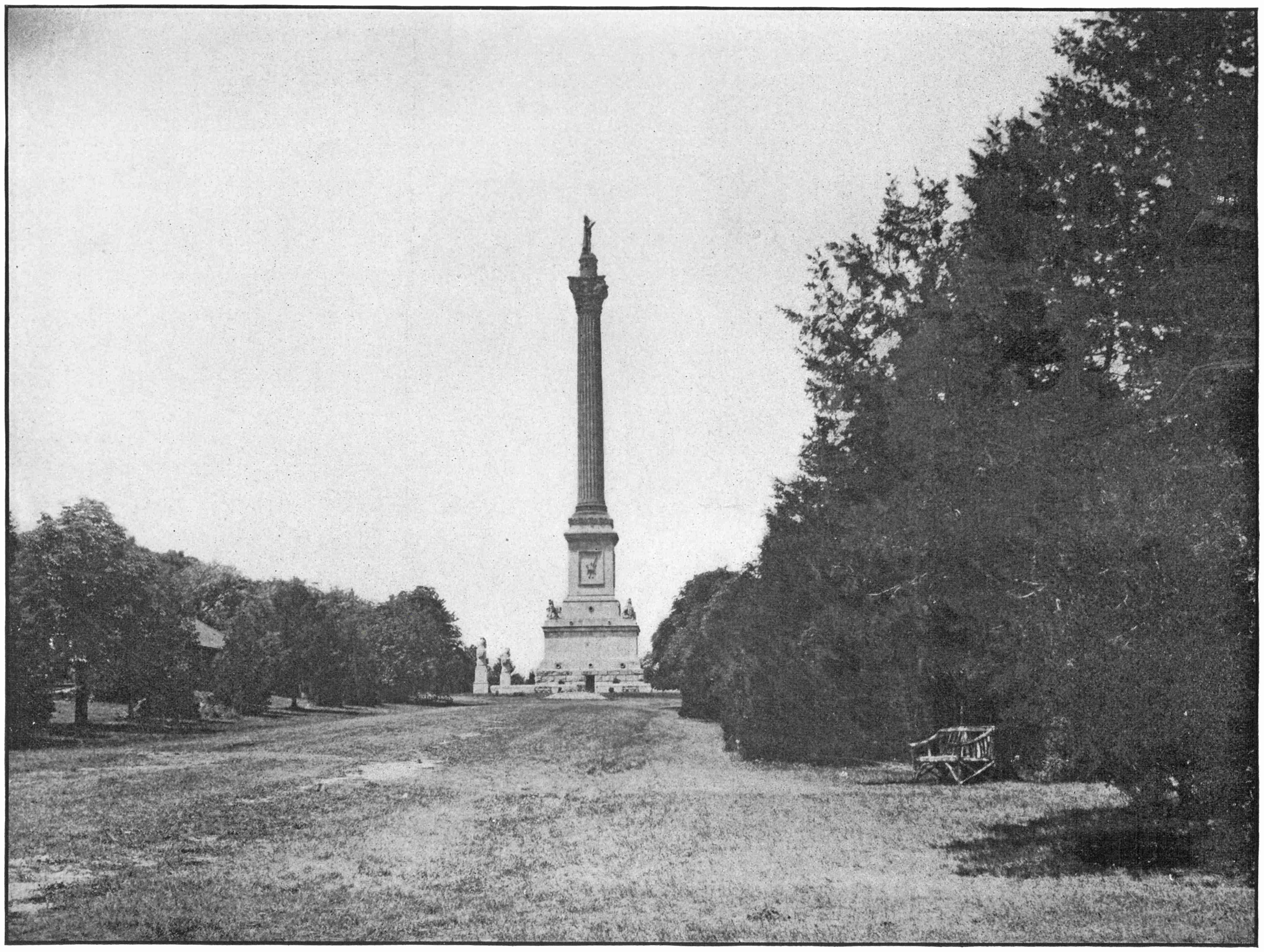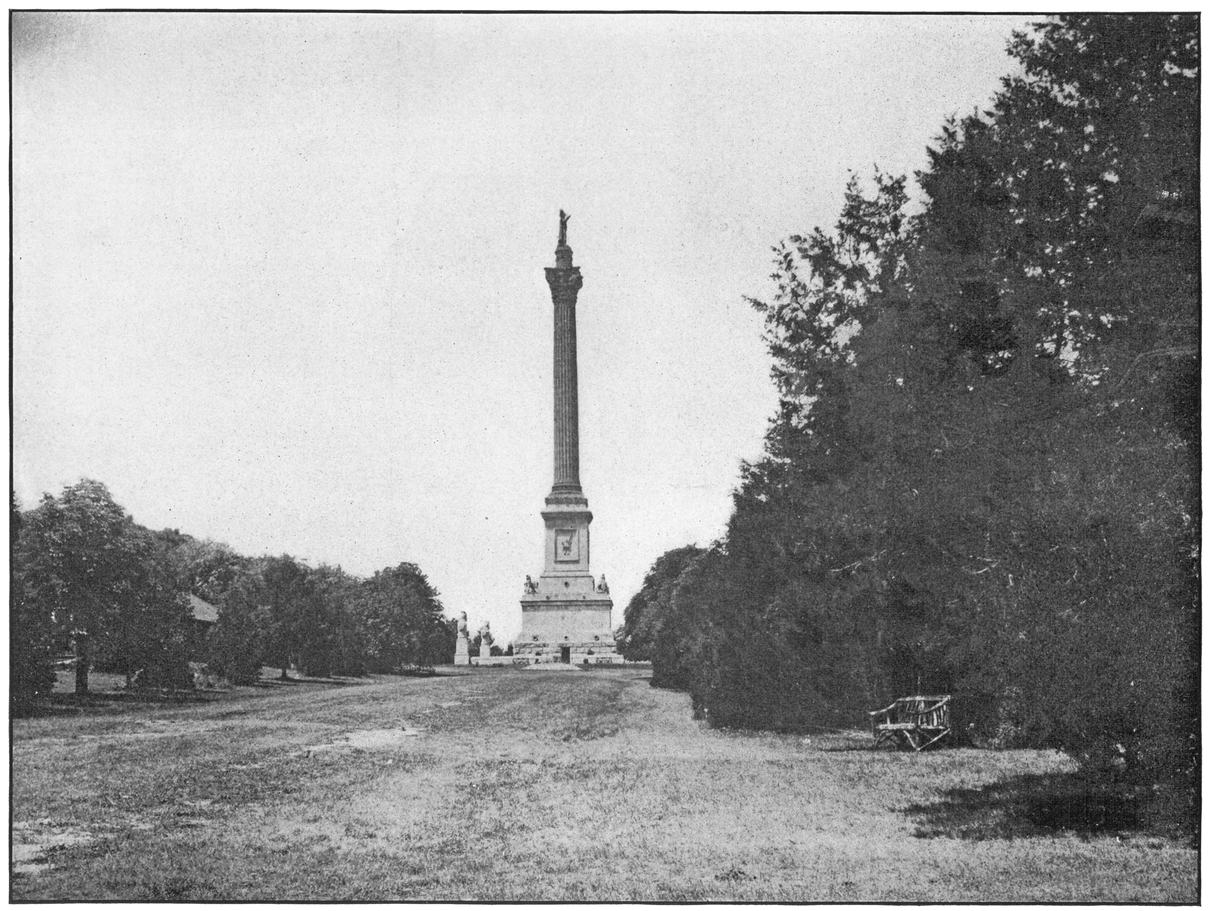 Stands on Queenston Heights, about four miles below the Whirlpool. It was erected to commemorate the memory of Sir Isaac Brock who fell in battle in the war of 1812. It is a noble shaft, 100 feet high, capped with a statue of Brock. It is seen for many miles in all directions.