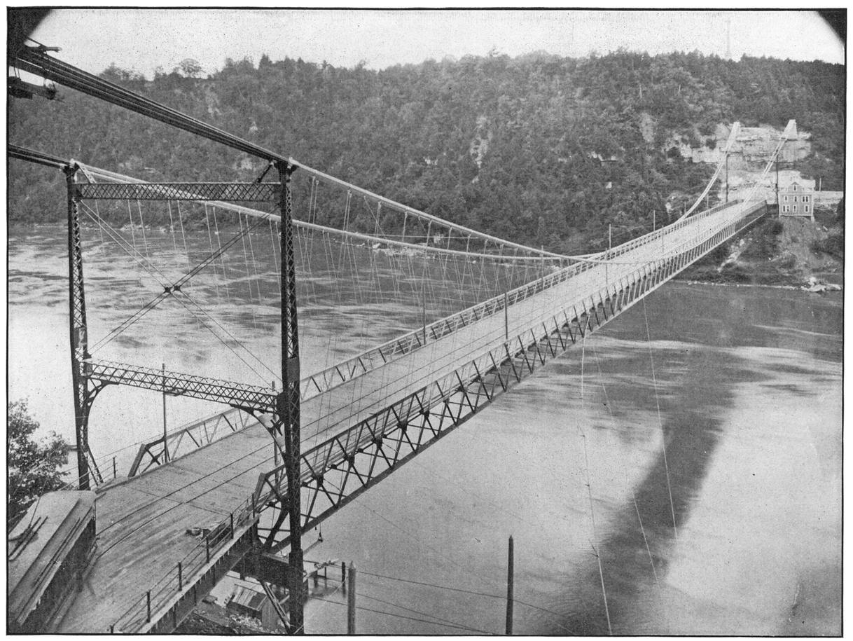 This Suspension Bridge is now the only one which spans Niagara River. It links Queenston on the Canadian side with Lewiston on the American side, seven miles below the Falls, and is crossed by the Belt Line trolley route about the Gorge. The suspended span is 800 feet, and it has a cable span of 1040 feet.