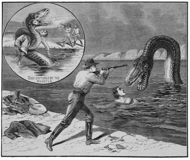 “Ike says that the monster swam very gracefully, being provided with fins, which acted as paddles, two on each side. He and the doctor each took a shot at it, but in consequence of their semi-paralyzed condition the shots did nothing more than to so scare[2] the creature that it took a header into the lake and was seen no more.