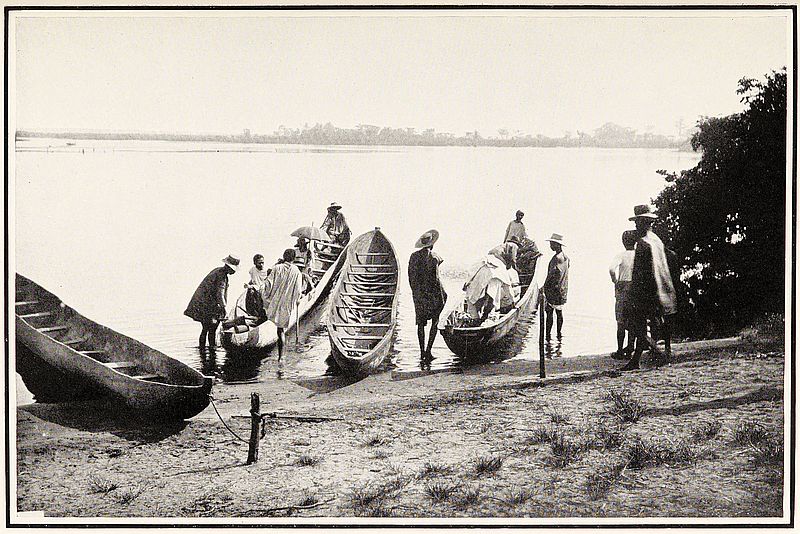 We were astir very early on the Monday morning, for there was a large amount of work to be got through before we could start on our canoe voyage. We got away from the town before seven, and half-an-hour’s ride brought us down to the river, where we found six large canoes, four of which were being loaded with our luggage. When everything had been arranged, we had to pay all our men, only about ten going through with us to Mojangà; and a few others had to be engaged in addition to row the canoes and help in various ways. About nine o’clock we got away and began our four days’ voyage down the Ikòpa. It was a pleasant change from the jolting of the palanquin to the smooth gliding of the canoe. These vessels were about forty feet long; and the one in which we went was three feet six inches beam, and two feet six inches deep, and had three paddlers, besides one at the stern to steer; as we were going down with the current, more men were not necessary. Two of the palanquins with their hoods were placed[294] in our canoe, for wife, nurse and little girls, while the little boys, in their palanquin, went in another one with Mr Street and Mr Briggs.
