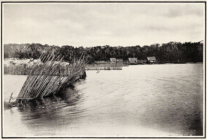 Although we saw no villages during this day’s voyage, there was evidence of some population, in people fishing along the river bank, canoes moored by the shore, and women drawing water, carefully avoiding going into the stream, and filling their vessels with a small gourd fastened to a long bamboo. The scenery also was more varied, there being lines of low hills, partly covered with wood, and the banks of the river lined with large trees.