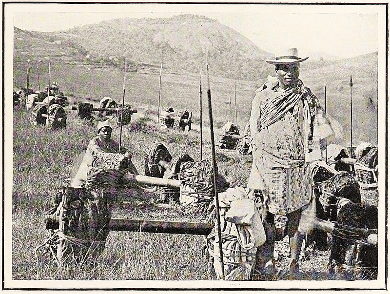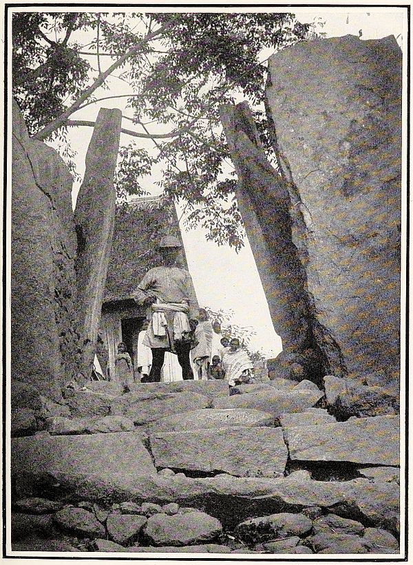 The stone is levered into position closing the opening. A deep fosse or ditch surrounding the village completes its fortification. The man in front is carrying two packages secured to a pole in the usual manner of the country