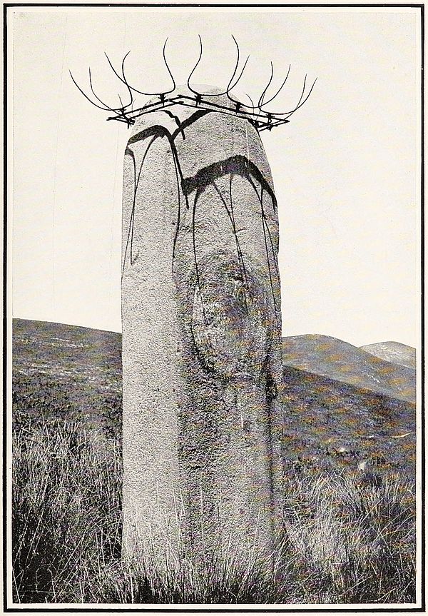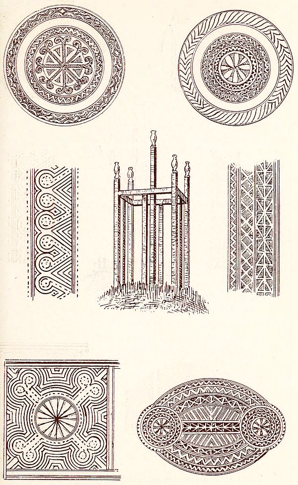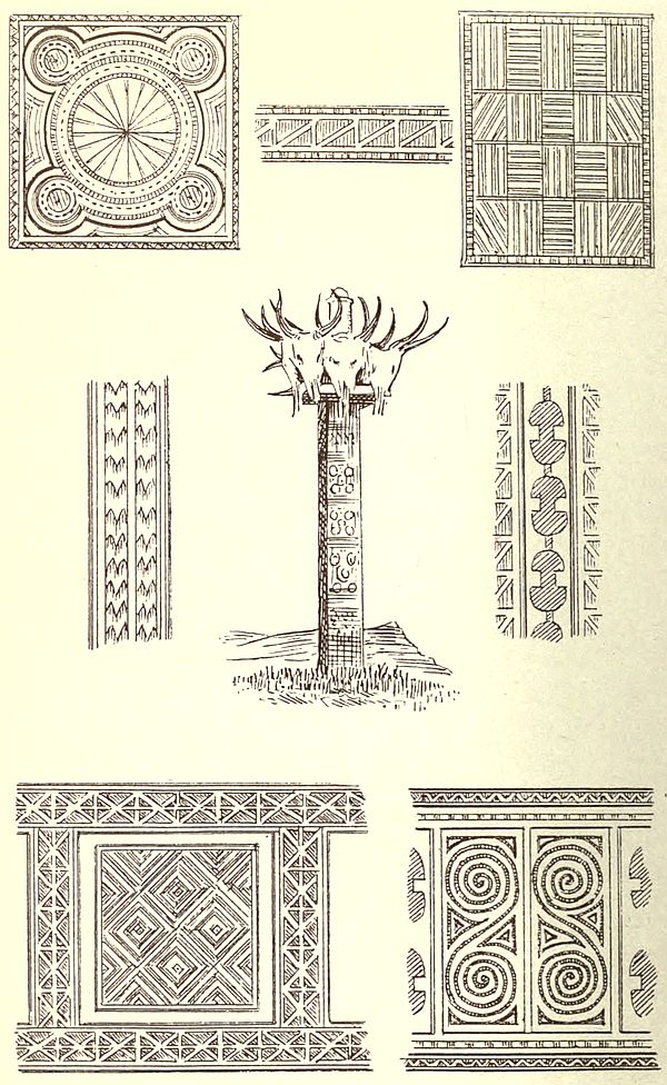 The following morning brought us to steep ascents of nine hundred and fifty feet, of four hundred and twenty, and then of six hundred feet successively, the last bringing us to Ivòhitràmbo (lofty town), well named, for it has a most elevated situation and higher than a good deal of the interior table-land to the west. I had noticed all the previous afternoon that on the very summit of the highest ground to the north was a lofty cone of rock. Perched upon this like an eagle’s nest was part of the village, the rest of the houses being a hundred and forty feet lower. The summit was forty-seven hundred and fifty feet above the sea; we were now on the high land of the interior and had come up twenty-four hundred and fifty feet since we breakfasted. As may be supposed, the view was most extensive; the plains of North Bétsiléo were not far distant, and soon we came to the long bare rolling downs of the central provinces. Uninteresting as these generally appear after four or five months without rain, they looked home-like, and the keen air seemed bracing and invigorating. We began to see rice-fields again and the scattered round vàla of the Bétsiléo. We had got into the country of a different tribe of people, with different houses, speech and customs. At the village where we stopped for the night was a good timber house, with elaborately carved central pillars, and we began to see again the carved memorial posts, which had so much interested us on our journey south.