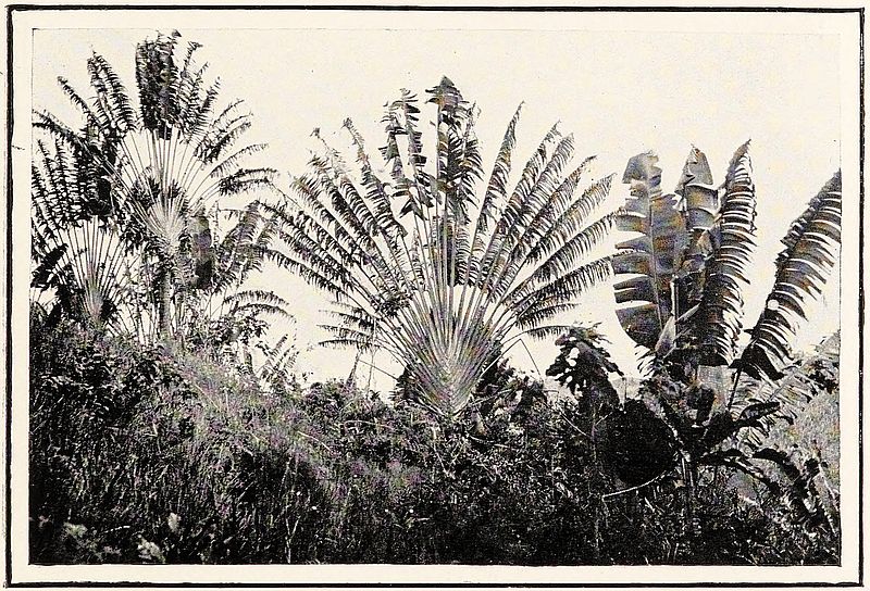We stopped on Wednesday night at a large village called Màngasoàvina, and the next morning passed along the eastern base of Andrìba, a lofty and very peculiarly shaped mountain, which had been prominent before us during the preceding day. It appeared to have a large flat top, and in outline resembled the stump of an immense tree left in the earth, its northern face being a stupendous perpendicular mass of rock. (Here I may remark, in parenthesis, that this Andrìba was expected, in the French war of 1895, to have presented the most formidable obstacle to the advance of an invading force and, in the hands of European troops, would certainly have done so.) In the afternoon we entered on the part called in Malagasy, èfitra, or desert, but which simply means an uninhabited region, and seemed to promise to be the most pleasant part of the whole route. A long deep gorge which we entered was beautiful with luxuriant vegetation, and in one of the lateral valleys I soon perceived the traveller’s tree, a sure sign that we were now from two thousand to three thousand feet lower than Imèrina. Every hollow was filled with trees; the hills became lower, and[290] the vegetation more distinctly tropical, with graceful palms and other trees common on the eastern coast; as well as species of ficus, ròtra (Eugenia sp.), hibiscus, tamarind and rofìa palms; and the mango, escaped from cultivation, often attains the dimensions of a very large tree.
