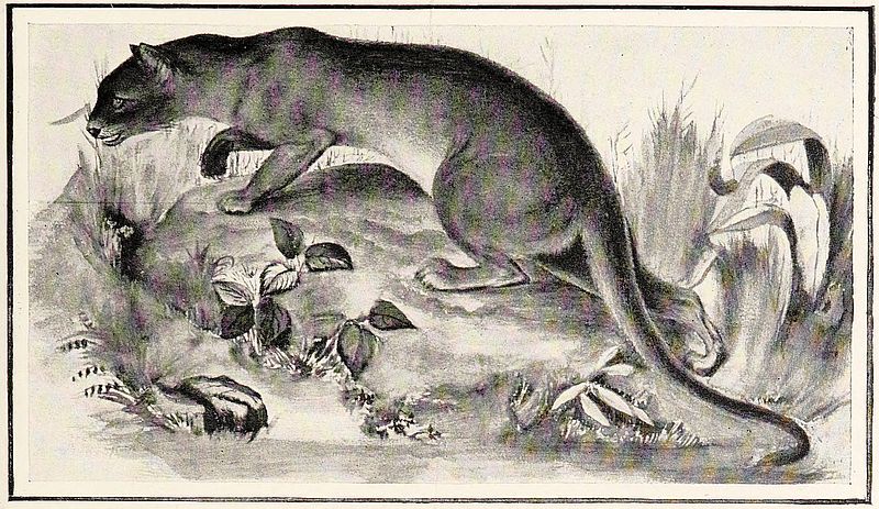 During this journey to the north-west, we saw no mammals except herds of oxen; but as there are a few others, it will be fitting here to say something about the largest carnivorous animal found in the island, especially as this district is its special habitat. This creature is called by the people, Fòsa (Cryptoprocta ferox), and although small is very ferocious, as its specific name denotes. The fòsa differs from most of the felidæ by the greater elongation of the body, including the head, and it is plantigrade, like the bears, and not digitigrade, like the majority of the cats. In its structure it resembles the jaguar, and in its colouring the puma, indeed it is very like a small jaguar, as it has thick glossy fur of a tawny-brown, which becomes somewhat darker under the body. Its total length is four feet eight inches, but of this the tail occupies two feet two inches, and it stands about one foot three inches high. For its size, the animal is powerful, but it is not dangerous to man, except when it is wounded, or at the breeding season. It is destructive to poultry and small animals, and it is able to emit a very fetid odour from an anal pouch, with which fowls are said to be killed. Examples of the fòsa have been seen in the[303] outskirts of the upper belt of forest on the east side of the island; and of somewhat larger size than the dimensions already given. A specimen I once saw was of a beautiful black colour, but I believe this was only a variety, and not a distinct species from the brown animal. The fòsa is much dreaded by the Malagasy, and, from its mode of attack, appears to be like an immense weasel, attacking large animals, such as the wild boar and even oxen. Like the aye-aye among the quadrumana, and many of the native birds, the fòsa has no near relative, and therefore a new family had to be formed for it, of which it is the only genus and species.