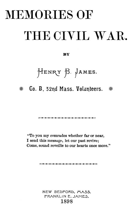 I have often wondered how it happened that I, born of quaker stock on my mother’s side (she was descended from the Kemptons, who were among the first settlers of our quaker city of New Bedford,) should have had such a natural leaning towards scenes of adventure and conflict. It may well have been that I inherited it from the paternal side of the house, for my father’s father, John James, was taken prisoner on board his ship during the War of 1812, and thrown into an English prison, and I have often, during my childhood, listened to his tales of warfare and bloodshed, and longed to be a man that I might fight and avenge the wrongs inflicted on my devoted country in its earlier days; and how I wished, as I read of the War of the Revolution, that I might have lived in those stirring days, and done my part in creating the American Nation.