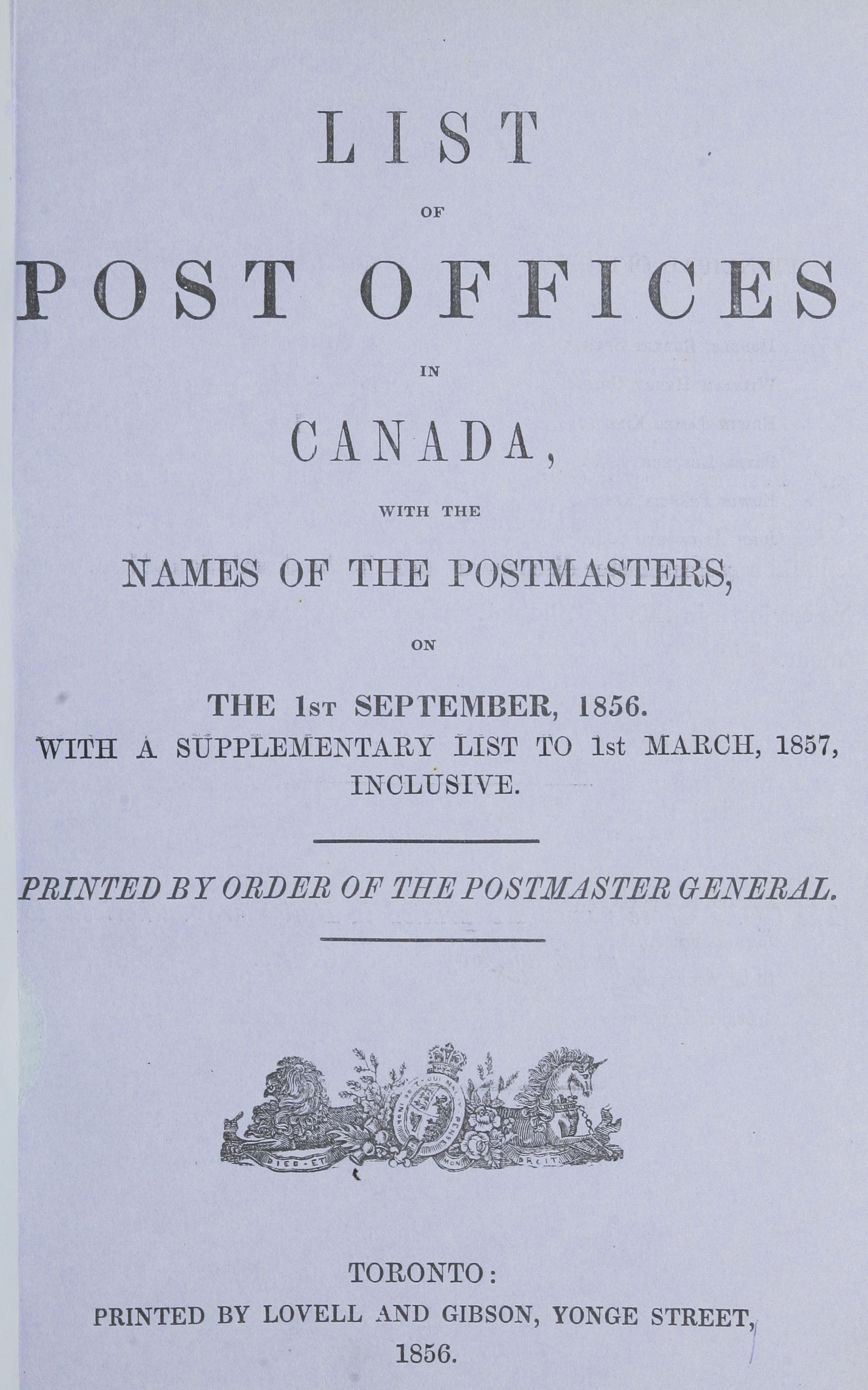 | NAME OF POST OFFICE. | TOWNSHIP IF IN CANADA WEST, AND TOWNSHIP, SEIGNIORY OR PARISH, IF IN CANADA EAST. | ELECTORAL COUNTY OR DIVISION. | NAME OF POSTMASTER. |