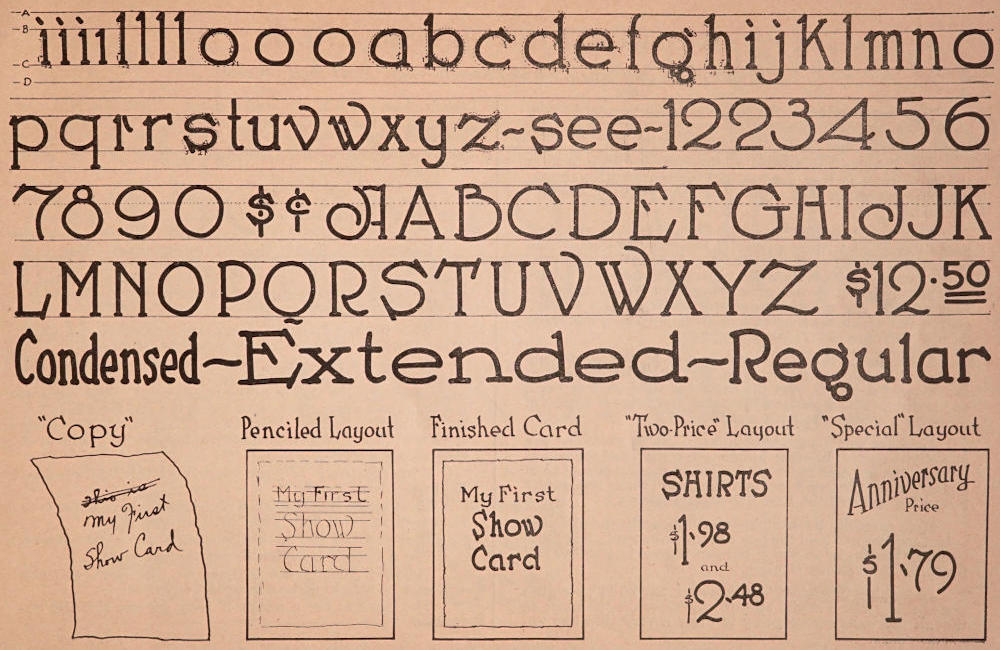 With this lesson thoroughly mastered—the student is advised to practice the layout work. The first drawing suggests the “copy” for a showcard as it is often handed to the card writer.