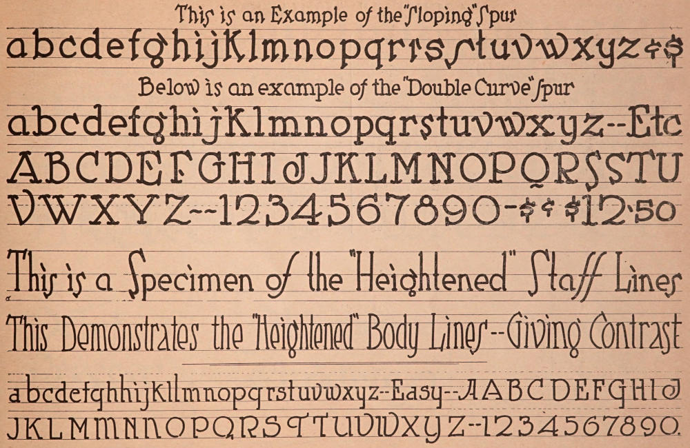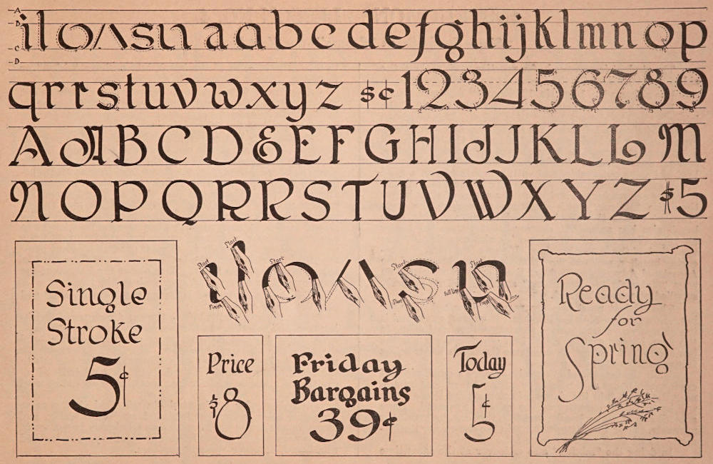 The last line of lettering on the adjoining reproduction shows some slight variations preferred by showcard writers, in that the spur at the top of some of the staffs is sharper, and on other letters the bottom spur of the first stroke is omitted. In working under pressure many showcard writers omit the spur in all first strokes on the h, k, m and n.