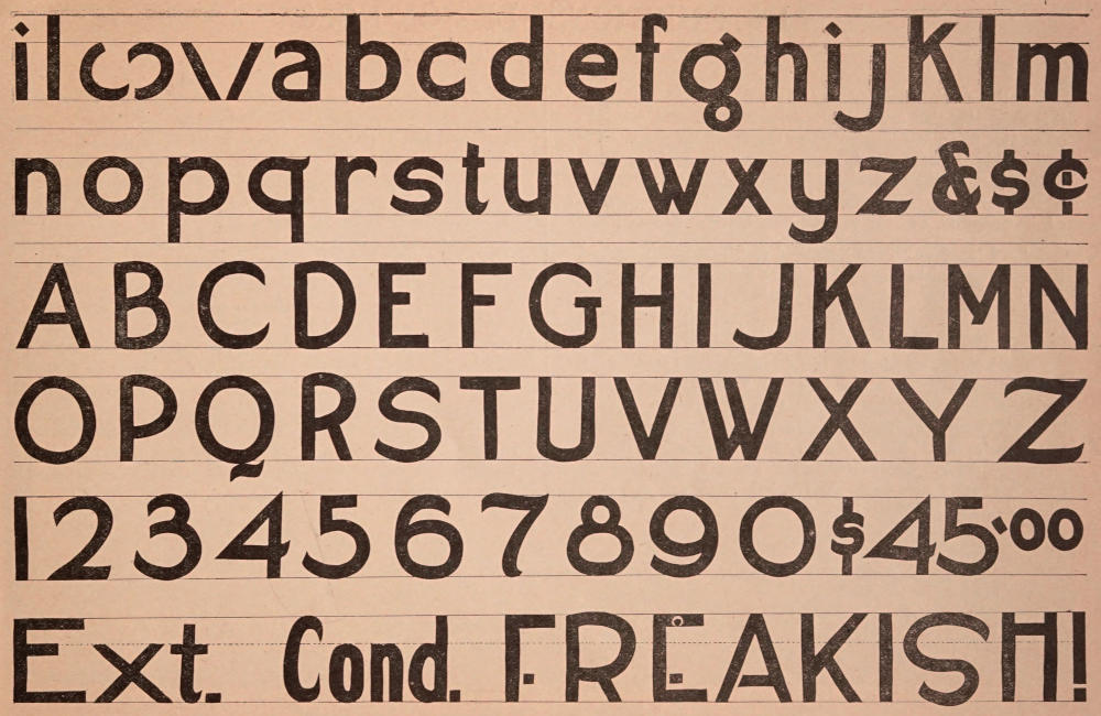 A point to be remembered in using this alphabet, however, is not to combine capitals in one word. Capitals can only be used in connection with the lower case letters. Some of the other alphabets, more specifically the “Egyptian,” work out very effectively in “solid caps.” However, this effect can never obtain in the case of the “Old English.”