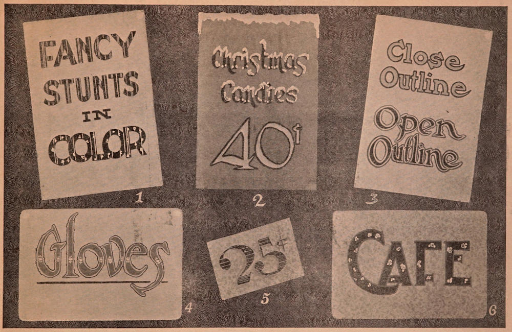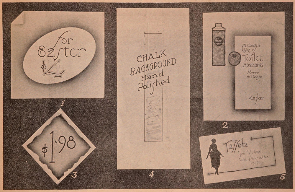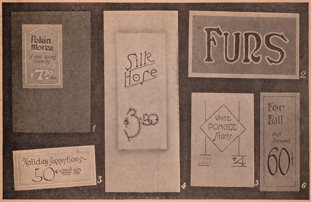 Price cards shown in the center of the reproduction were made of white cardboard. Numerals were written in with black ink with model “B” speed ball pen. Each card features a different colored, flat band border of dark blue, tangerine, maroon, orange, mauve and bright yellow, respectively. This border is made by “chiseling” the brush out perfectly flat and laying it full width, or whatever width may be desired, on the edge of the card and dragging it steadily down on each edge of the card. Colored borders on price cards add much to their attractiveness. Try out the combinations suggested.