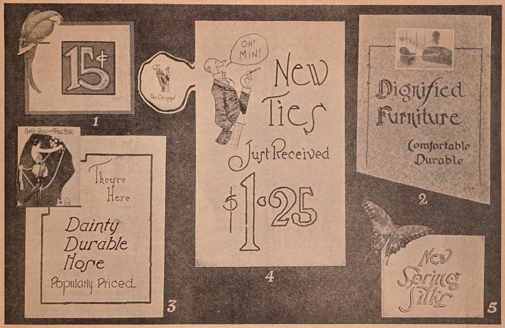 During the intermission between lessons, possibly covering several days, the student should lay out and letter in other showcards from original copy or from copy suggestions secured through observing the showcards in large stores, or from the advertisements in the newspapers.