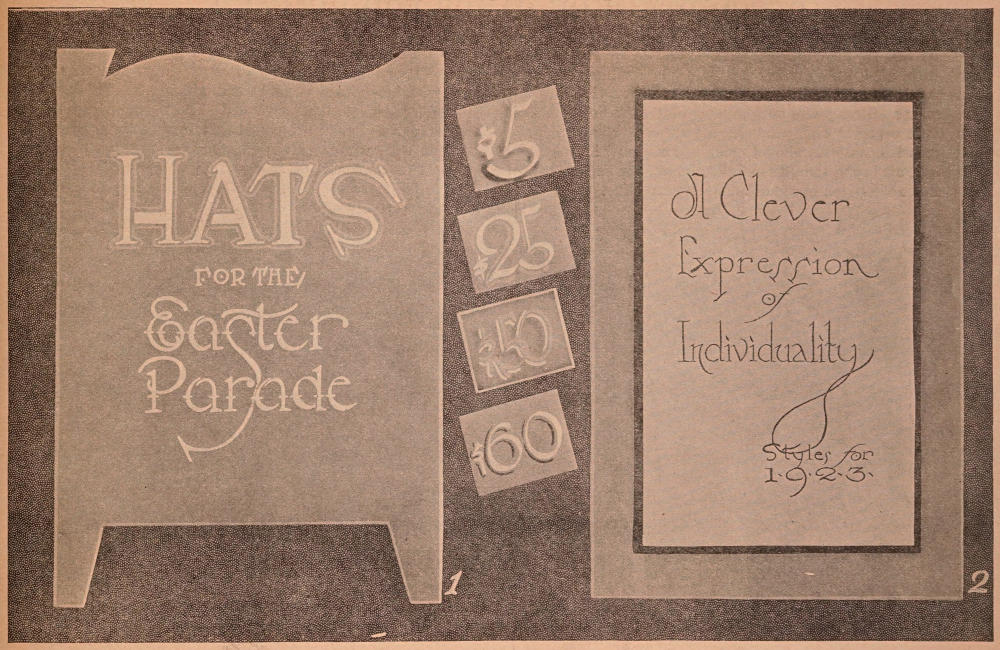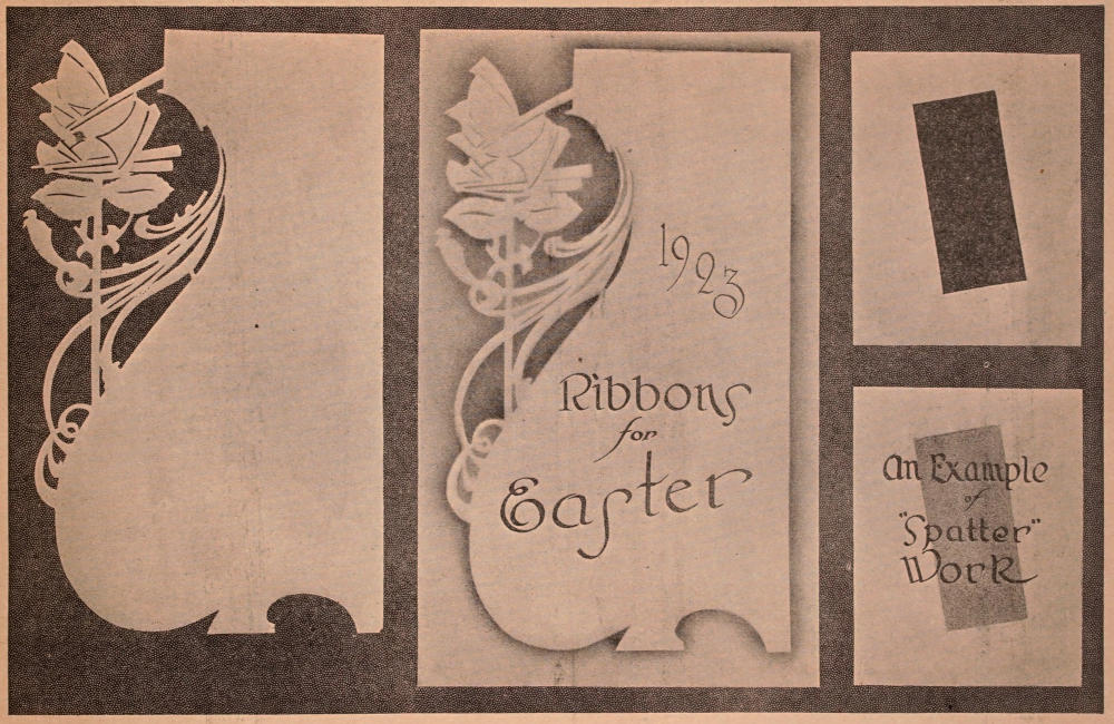 Card No. 1. Size 16×22 inches. Fancy cut-out, heavy purple mat cardboard. Card was beveled and makes a very pretty design for Easter. The lettering was done with the No. 12 brush, using white ink. The word “Hats” was outlined with lavender. The words “Easter Parade” were cross-striped, as shown, with gold ink although this appears as almost white in the reproduction.