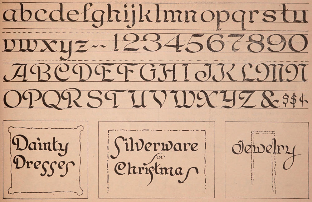 While the “Old English” stands out in an unusual way for beauty and dignity it must at all times be used with the utmost discrimination. It does not lend itself ordinarily to showcard or poster work and finds its best purposes in connection with Christmas showcards or monogram effects. Jewelry, silverware and gift suggestions of the valuable variety express themselves to the highest advantage in the “Old English” alphabet.