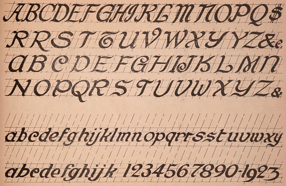 This alphabet is designed for either the broad pointed pen or brush. The round speedball pens may also be used for a “slanting” alphabet, if desired.