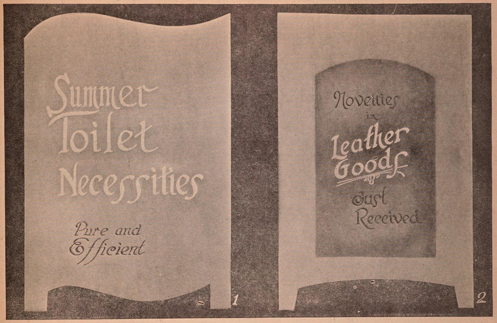 Such cards add much to the attractiveness of any window display and students should procure samples of this paper stock from some source and note its beautiful finish.